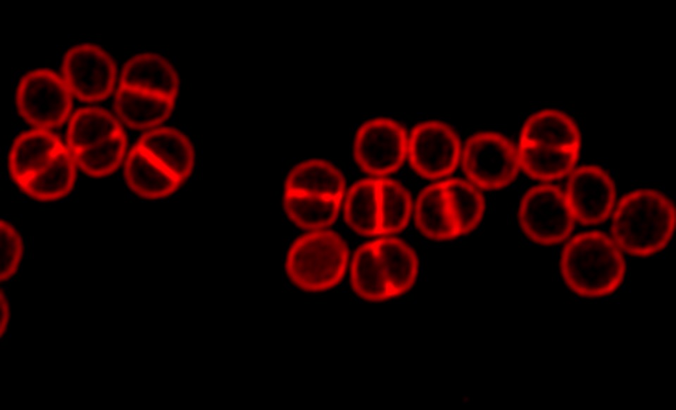 We have also uncovered new, surprising, levels of regulation during cell cycle progression. The best example links a cytoplasmic protein involved in chromosome segregation, FtsK, and a protein anchored at the outer layer of the cell (the cell wall), required for splitting of the division septum, Sle1. We found that FtsK regulates the levels of Sle1 so that the cell can delay septum splitting while chromosome segregation is taking place, or when DNA damage occurs. Tight regulation of the timing of septum splitting during the cell cycle is essential to avoid exposure of an immature cell surface, which would be easily recognized by the infected host, leading to clearance of the bacterial cells by the innate immune system.