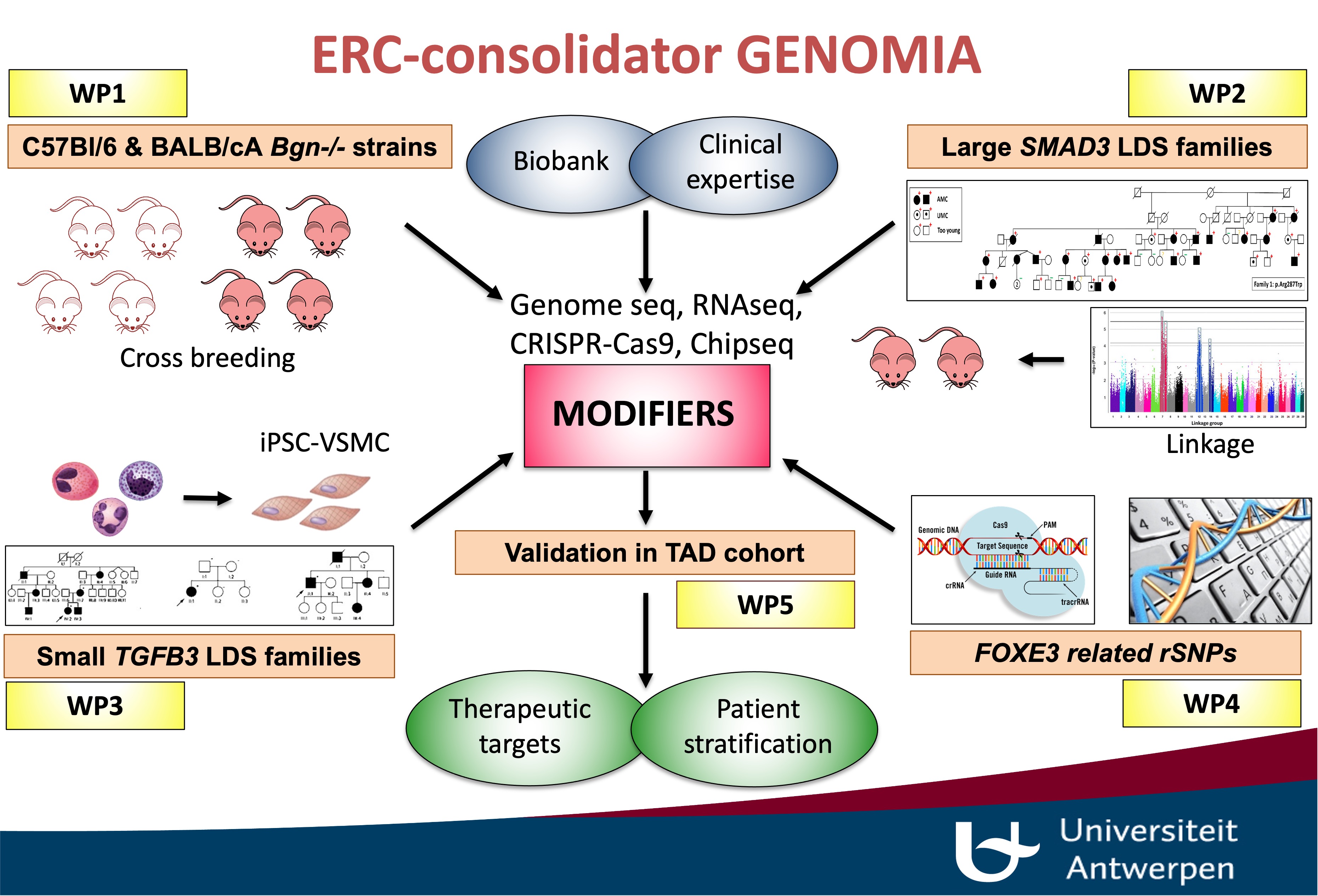The advent of next-generation sequencing technologies delivered the promise of accelerating our molecular understanding of TAAD. In this project important clinical-molecular challenges were addressed. Many syndromic and non-syndromic cases exhibit non-penetrance and substantial variability in clinical presentation, even among individuals carrying the same genetic mutation. This variability ranges from asymptomatic cases to sudden aortic dissection leading to early death, with the mechanisms behind this diversity still poorly understood. This project employed four innovative strategies to uncover genetic modifiers that influence aortopathy in humans and mice.