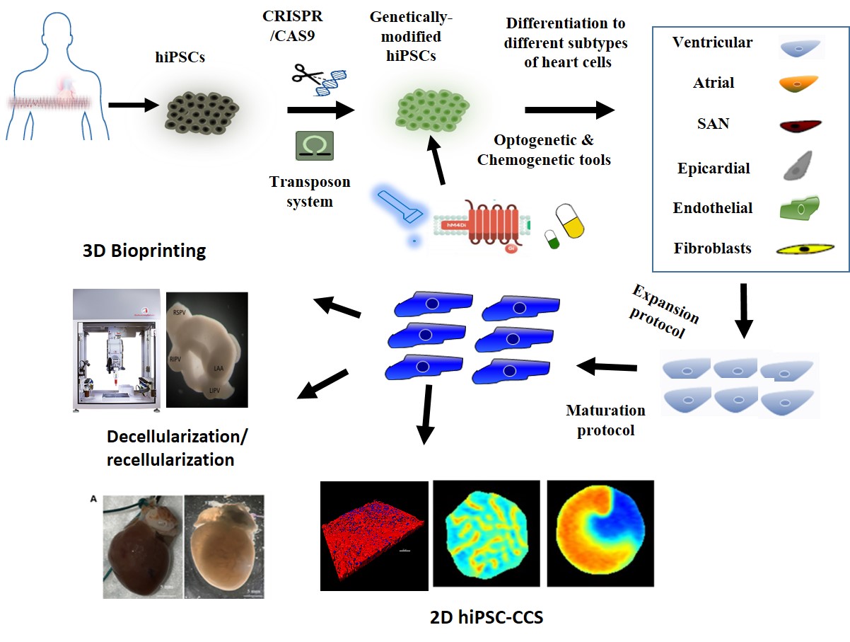 To address these challenges, we aimed to combine advances in genetics, human induced pluripotent stem cells (hiPSCs) and genome-editing (CRISPR) technologies, development biology-inspired differentiating systems yielding specific heart cell subtypes, novel tissue engineering strategies, state-of-the-art electrophysiology methodologies, and emerging concepts from the fields of optogenetics and chemogenetics.