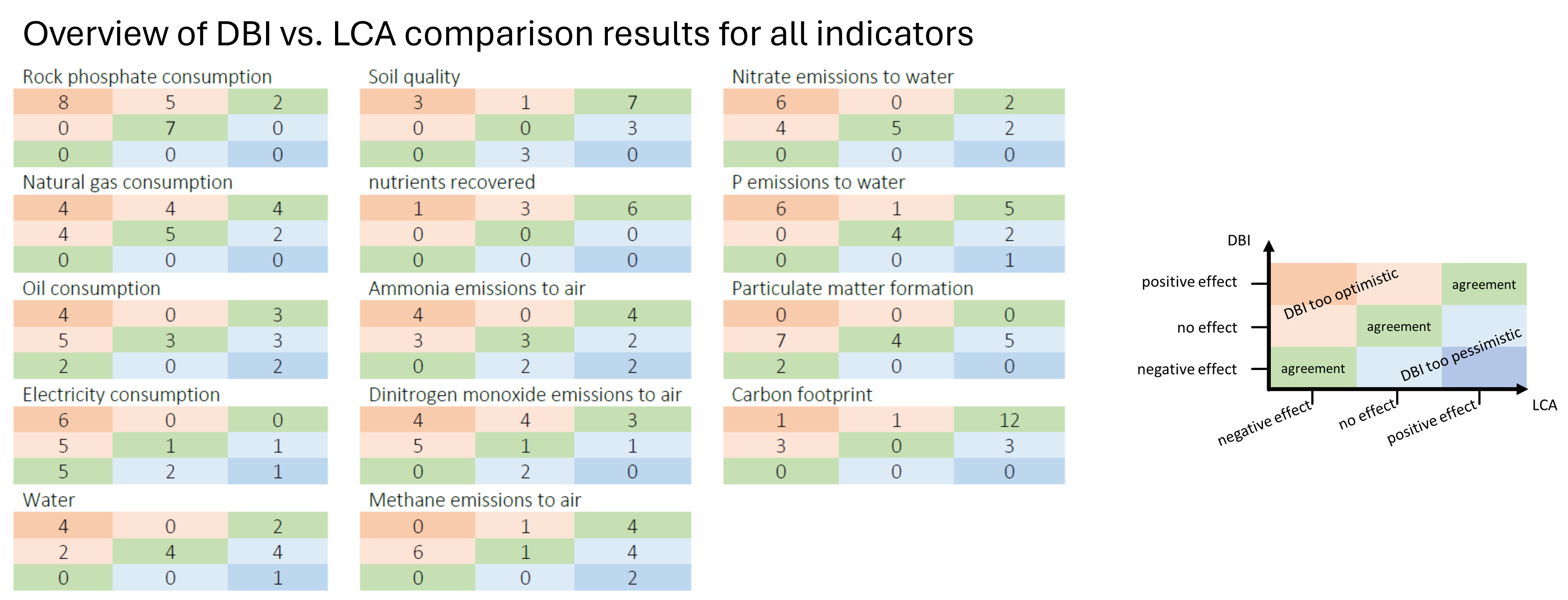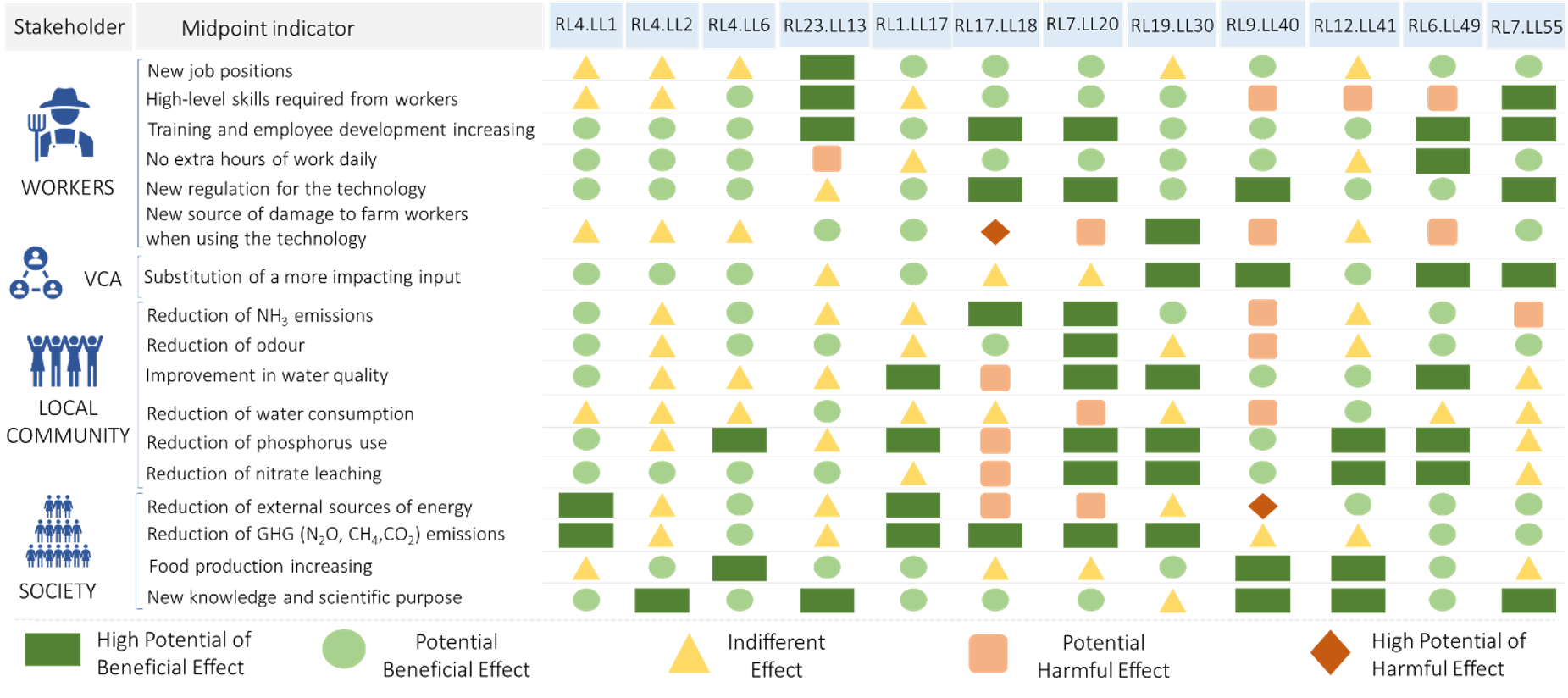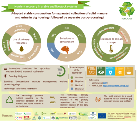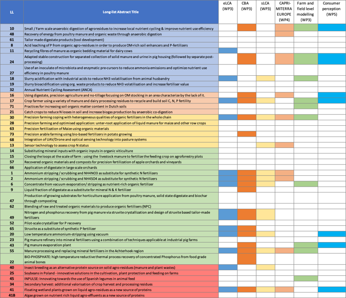LCA compared the impacts of some of the innovative solutions. Although the majority of solutions directly reduced environmental impacts, resource use and up/downstream impacts sometimes outweighed the positive impact on CNP recovery and recycling (D3.4) which is a key message for future work. Social LCA identified potential social hotspots and opportunities, but also made clear that further development of sLCA methodology is necessary (D3.4). Economic feasibility for baseline production systems as compared to optimized systems showed that this is very case specific and highly dependent on the actual economic framework (e.g. energy prices, regional nutrient surplus, etc.) (D3.3; D3.6). To assist farmers in this a free online webtool was developed to support stakeholders in the economic evaluation when using bio-based fertilizers.
