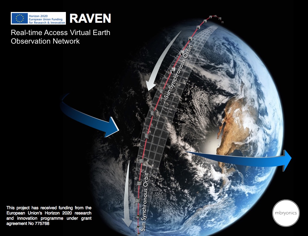 mBryonics is developing an optical satellite network architecture around its reliable and low error rate optical links, enabled by adaptive optic atmospheric mitigated feeder links. Power efficient optical links with adaptive optics allow the use of smaller satellites for high throughput data downlinks. Commercial EO operators are beginning to demonstrate that these smaller satellite platforms, known as CubeSats/NanoSats that are the size of a shoe box, are reaching a level of maturity and sophistication that emphasises the important role these spacecraft will play in the future of EO. Not to mention Remotely Piloted Aircraft Systems/High Altitude Pseudo Satellites. We call this optical satellite network architecture and distributed optical ground segment RAVEN: Real-time Access to a Virtual Earth observation Network. RAVEN is an end-to-end system architecture that will enable integration of satellite services into terrestrial applications and future networks, such as the 5G ecosystem.