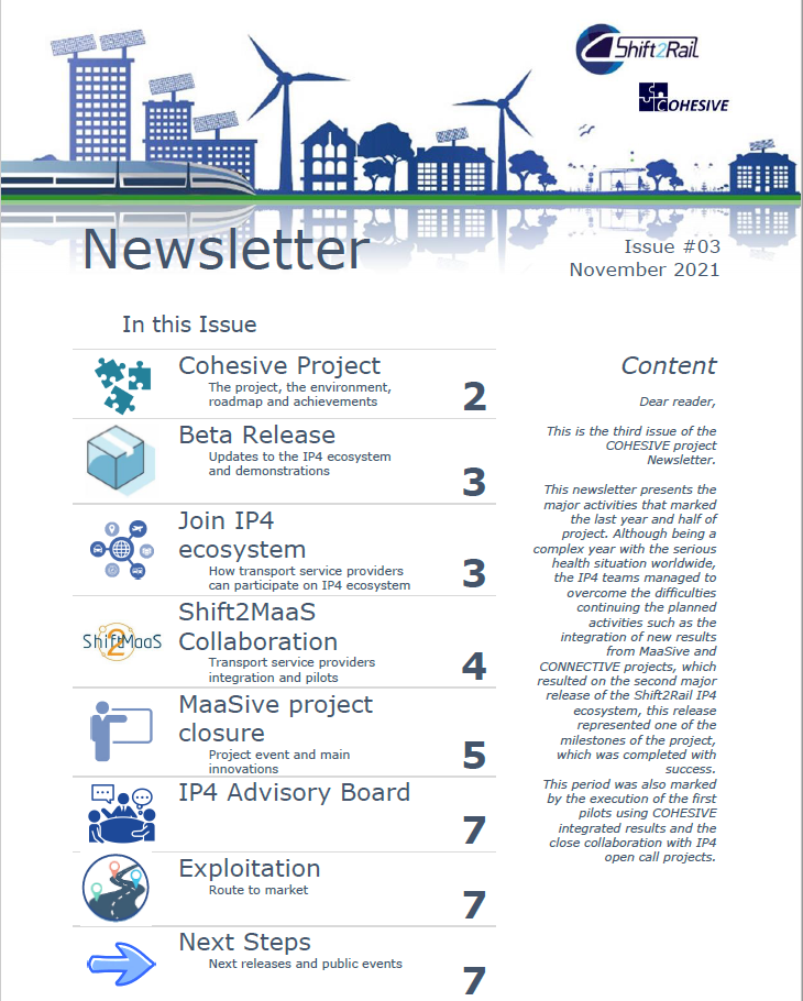 In conclusion, the COHESIVE project was a successful initiative that played a significant role in the IP4 "IT solutions for attractive Railway services". The project successfully integrated and demonstrated various technological innovations developed under IP4 and provided valuable insights into providing citizens with a seamless door-to-door multi-modal journey experience, maintaining rail as the backbone of the mobility ecosystem.