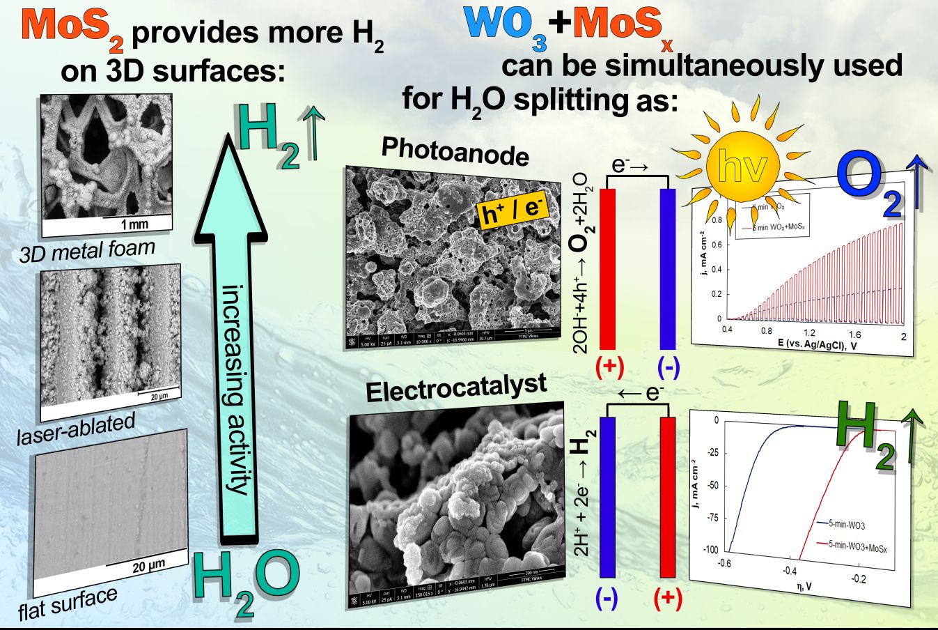 - highly HER active MoS2 films were electrochemically deposited onto versatile surfaces. The best HER could be reached with MoS2 films that had been deposited on 3D copper foam electrodes. Furthermore, MoS2 was combined with WO3 in order to create multi-functional composites that can act as photoanodes and electrocatalytic cathodes. This was achieved by carrying out plasma electrolytic oxidation (PEO) of W in an electrolyte also containing precursor MoS2. The resulting WO3+MoSx composite is comprised of monoclinic WO3 and non-stoichiometric MoSx. Due to this composition the composite can be used as a photoanode for photooxidation/water splitting, but also as an electrocatalyst for cathodic HER.