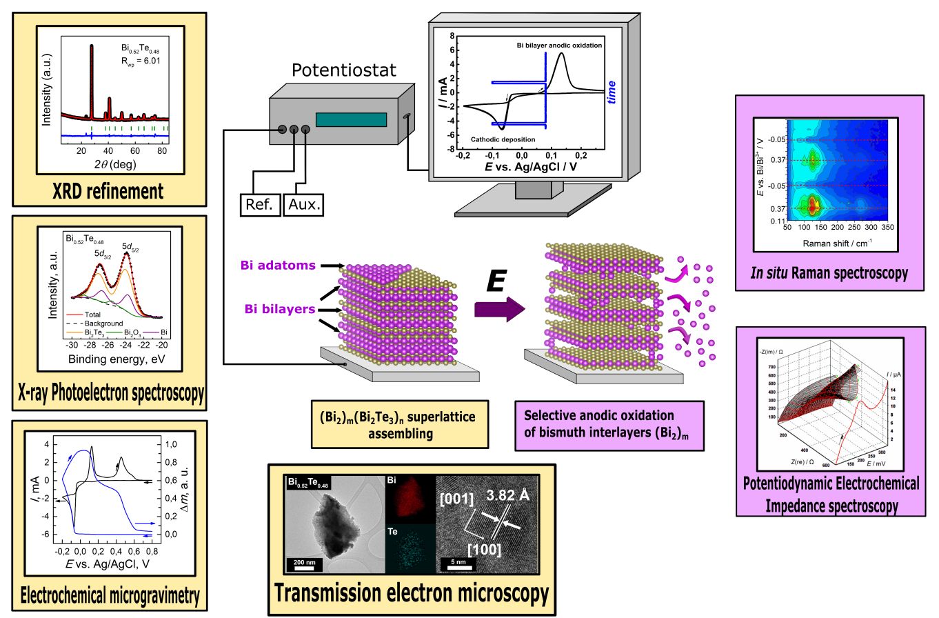 - Electrochemical assembly of superlattice structures of (Bi2)m(Bi2Te3)n series composed of bismuth telluride quintuples and bismuth biatomic layers with variable and controlled ratio of the both components was developed (Fig. 2)