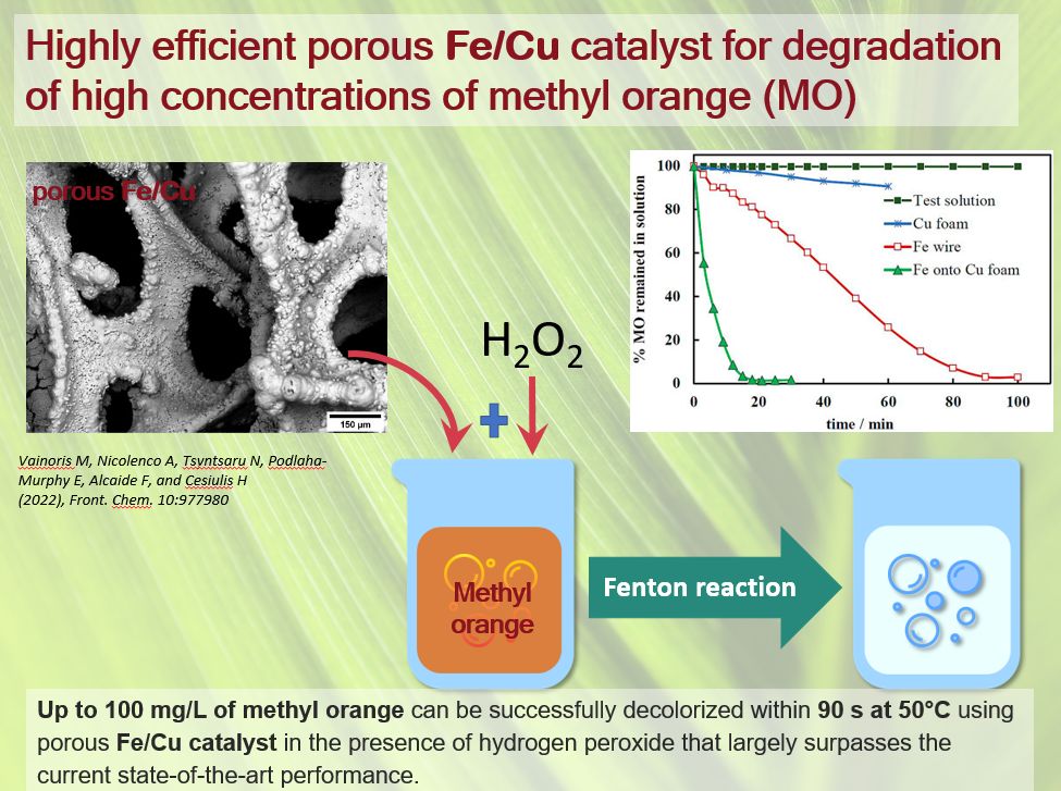 - The developed porous Fe/Cu catalysts can effectively decolorize methyl orange at high concentrations within a short time, making it a cost-efficient and environmentally friendly solution for treating azo dyes in water. The optimization of conditions such as hydrogen peroxide concentration, temperature, and catalyst loading can further improve the performance of the Fenton reaction for the removal of methyl orange from water.