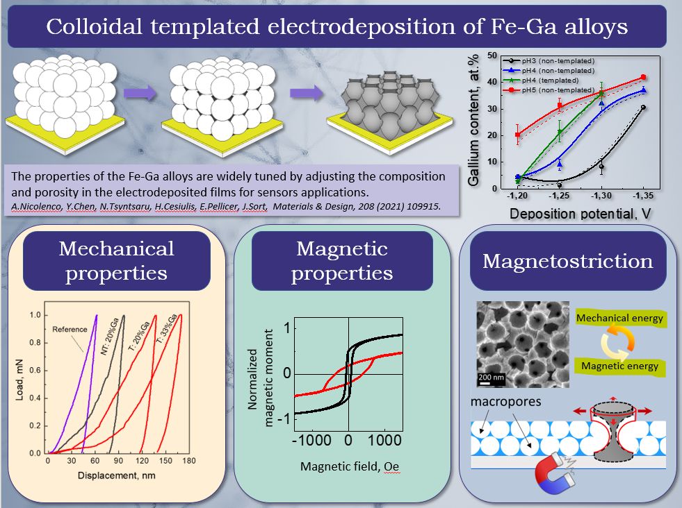 - Fe-Ga alloys have become a promising material for micro- and nanofabrication technologies due to their unique combination of magnetic and mechanical properties, including high magnetostriction. The ability to change dimensions in response to external magnetic fields makes Fe-Ga alloys especially valuable. The synthesized new porous Fe-Ga films offer potential for the development of strain-engineered nanomaterials such as energy transducers or magnetoelectric composites (Fig. 4).