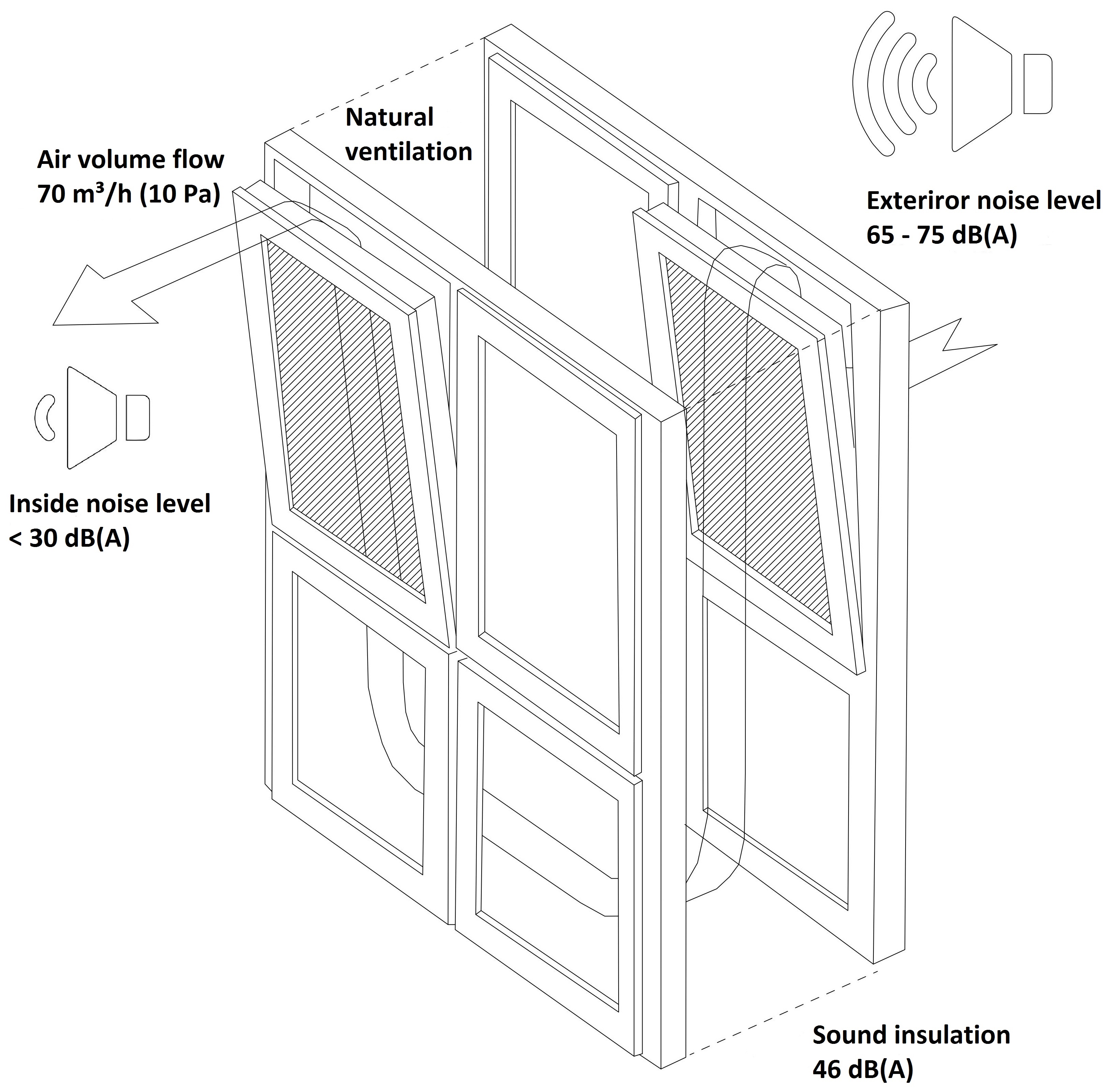 The unique selling point of the Eilenburger soundproof window is an optimised construction principle. It consists of two window levels with a peripheral edge frame in the form of a perforated plate. Specific properties can be derived from the special construction design. Due to the staggered arrangement of the ventilation blades, the air flow is directed specifically into an interior. Technologically, the soundproof window can strongly dampen the noise from outside due to its construction in tilt position. At the same time, fresh air supply is guaranteed as with an open window.