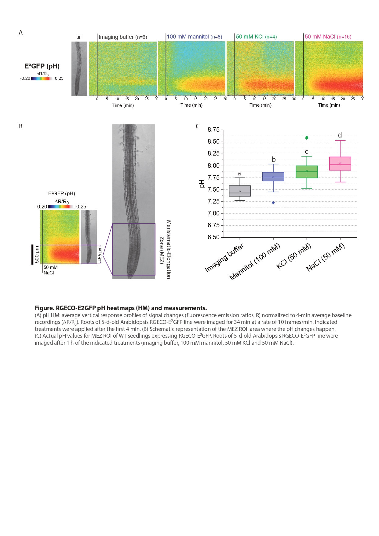 Unfortunately, it has been not possible to publish the results of sigNal project yet, but the manuscript is in progress and it will be submitted to an international peer-review journal as soon as possible. For this reason, a complete result overview cannot be publically publish here yet. However, in the attached figure, the pH heatmaps for different treatments are shown (A), where it can be obseved the site-restricted location of the root alkalinization. This zone has been used to define the MEZ ROI (B), that has been used to calculate actual pH values under diferent treatments. Attached figure also shows the actual pH values for 1 h incubation control, mannitol, KCl and NaCl treatments (C), where the difference in alkalinisation leves can be observed.
