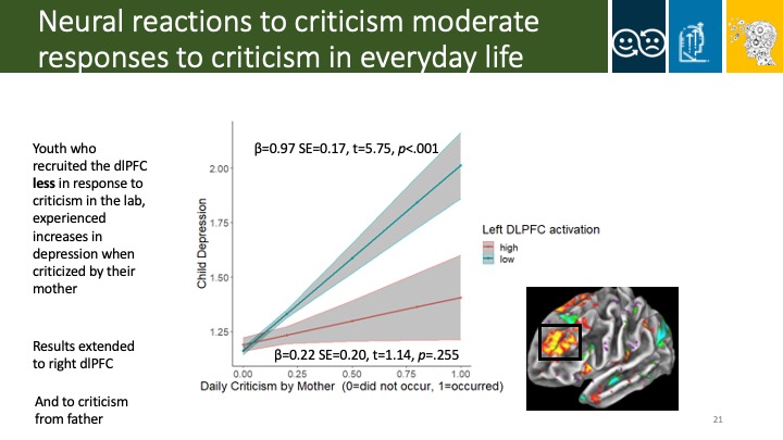 In addition to the study which included fMRI we collected data from a larger group of children (N=71) and their mothers. The mothers reported their past and current depression using questionnaires and the children completed a 21-day daily diary in which they reported experiences of criticism and praise from family members and friends. The results of this study showed that whereas all children respond to criticism from family members (i.e. mothers, fathers, or siblings) with transient increases in depressive symptoms, only children whose mothers had a history of depression showed persistent increases in depression in response to familial criticism. In addition, only children whose mothers had a history of depression showed transient increases in depression when friends criticized them. Thus, this study suggests that children of mothers with depression are more sensitive to criticism compared to children of mothers without depression. Finally, praise from either parent was related to lower levels depressive symptom for all children.