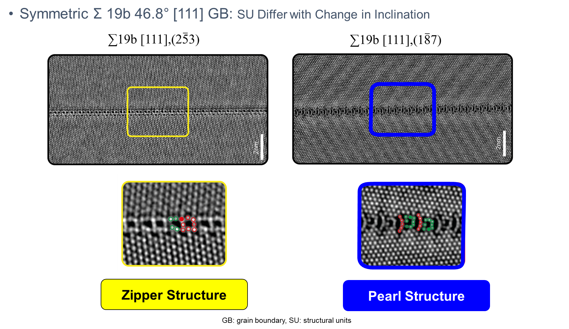 For the formation of disconnections, the structural units play an important role as they can exclude some Burgers vectors and step heights in case they don’t match with the repeat units of the structural GB motifs as found by atomistic simulations 19. The gained fundamental knowledge on GB atomistics is not only of academic interest, but has important consequences for grain growth, shear coupled GB motion and applications of metallization and conduction lines in semiconductor devices.