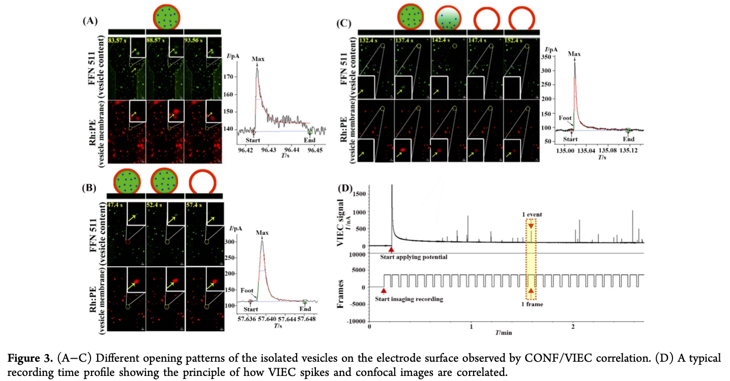 iii. Lipids in signaling plasticity, nanoimaging. We have developed a paradigm for plasticity in exocytotic release from a cell model by use of repeated stimulations and shown a key parameter is partial release (published in Proceedings of the National Academy of Sciences, USA) and followed this with mass spectrometry imaging of model cells with similar paradigms. This comparison has been published in the International Journal of Chemical Sciences. We have also developed NanoSIMS strategies to quantitatively examine the contents of single nanometer vesicles across their structure, published in ACS Nano. We have also developed combined electrochemistry and NanoSIMS strategies to examine the effects of iron homeostasis on partial release (Angewandte Chemie). Finally, we found that omega-3 and-6 fatty acids alter the lipid composition of membranes and vesicle size thereby regulating exocytotic release and catecholamine storage (ACS Chem Neurosci). We used combined confocal fluorescence microscopy and electrochemistry to develop a method to examine the dynamics of vesicle opening on the electrode surface (ACS Measurement Science Gold). This is shown in Figure 3. This led to a new hypothesis of the surface reaction chemistry required for the vesicle to undergo electroporation.