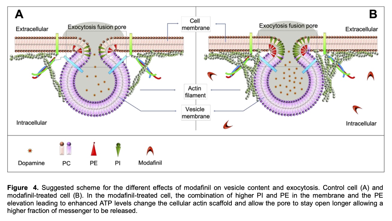 iv. Drugs, zinc, lipids, and learning/memory. We have been highly successful here showing that drugs that affect cognitive ability (cocaine, methylphenidate, zinc, barbiturates, lidocaine, chemo treatment drugs, etc) all affect exocytosis and several have now been shown to affect the lipid membrane structure providing a potential mechanism for understanding the initiation of plasticity. These studies have been published in numerous recent papers. We showed that the drug modafinil changes the lipid composition of the brain (Angewandte Chemie) and then proposed a mechanism for the action of modafinil on cognition (QRB Discovery, see Figure 4). We have found that on our model systems, all drugs that are known or suspected to diminish cognitive ability in humans cause a decrease in the partial release fraction in our model cell systems. In contrast, to date, all drugs that are known or suspected to increase cognitive ability in humans result in an increase in the fraction of exocytotic release. This forms the basis for a preliminary model of the initiation of plasticity and we feel could be important in the mechanism of short-term memory.