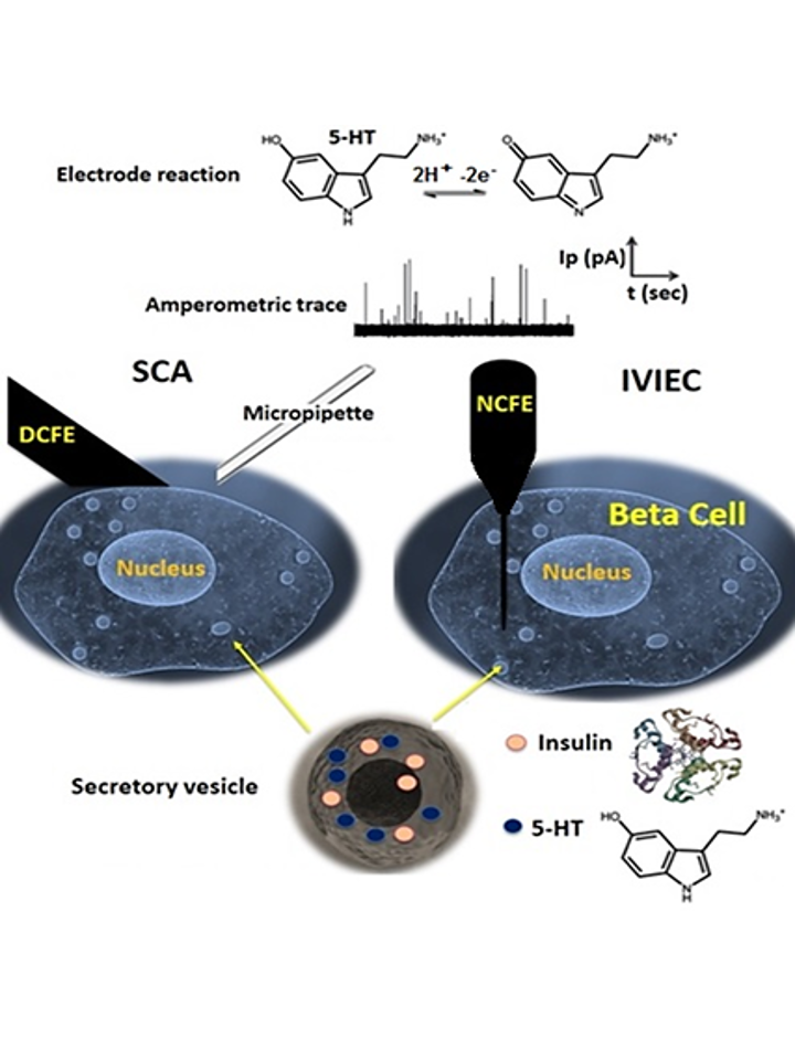 i. Determine if partial exocytotic release is ubiquitous in nature. We have carried out experiments with both pancreatic beta cells and at an octopamine-containing neuron in the fly larva to show that partial release is the predominant form of exocytosis for insulin/serotonin and octopamine, respectively. We published this in two papers in Angewandte Chemie. See figure 1. We published another paper in Angewandte Chemie examining the release of serotonin from gut BON cells, which is partial. We recently examined the serotonergic fly neurons in Drosophila and found some vesicles release about 30% of their cargo and some essentially 100%. The general theme has been that the majority of exocytosis is partial.