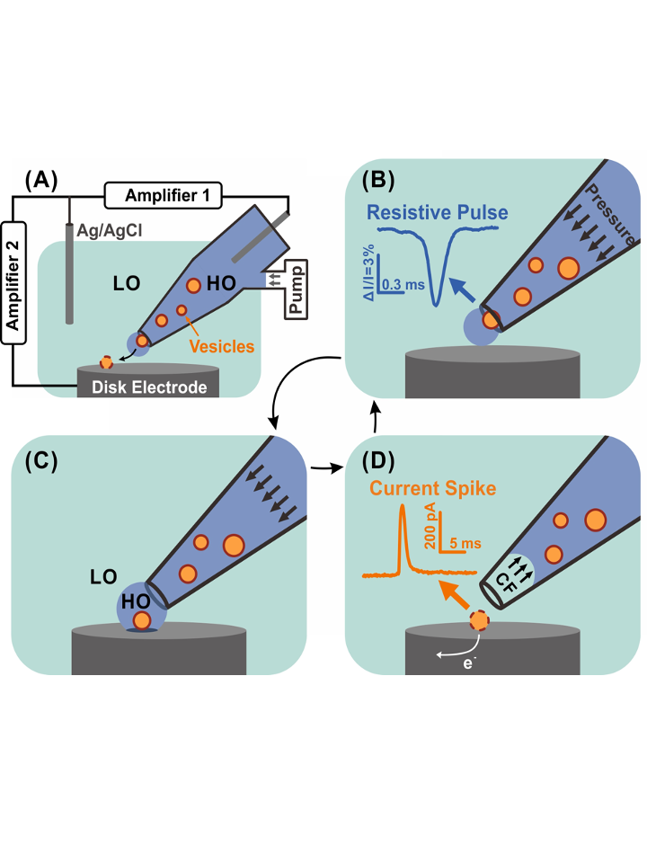 ii. Vesicle measurements and nanoscale subvesicular measurements. We have developed two types of nanopore electrodes that can be used to measure vesicle content and size, one for extracellular (see figure 2) and the other for intracellular experiments. These works have both been published in the Journal of the American Chemical Society. We used nanoscale secondary ion mass spectrometry (NanoSIMS) to quantify the content of transmitter vesicles and to view the difference between the dense core and the halo of the vesicle. We then used it for the analysis of partial release from vesicles by showing that labeled drug was taken up during exocytotic release and transmitter was decreased by 60% after stimulation of PC12 cells. These works were both published in ACS Nano. We then used NanoSIMS to quantitatively probe the halo and dense core in a paper in Int J Molec Sci. We used correlative transmission electron microscopy (TEM) and NanoSIMS imaging to examine the relation between fraction of partial exocytotic release and vesicle diameter to test the hypothesis that they are dependent. We found they are not (Angewandte Chemie). We also made great progress with electrochemistry showing that the Hofmeister effect can be used to regulate exocytosis and to develop compartment-selective sensors for vesicle content. We published these works in the J Am Chem Soc and two in Angewandte Chemie. We have investigated the pore opening of single vesicles at electrified interfaces, showing that vesicles open via electroporation towards the electrode surface (ACS Nano) and used combined STED and NanoSIMS to examine stress granule turnover in neuronal progenitor cells (Int J Mol Sci). Furthermore, we developed a method to measure the contents of exosomes and found that those from adrenal chromaffin cells contain catecholamine neurotransmitters (J Am Chem Soc). We also used our methods to discover that reactive oxygen species are formed by stress granules and went on to show that this release apparently controls homotypic fusion of vesicles in vitro, both works published in Angewandte Chemie.