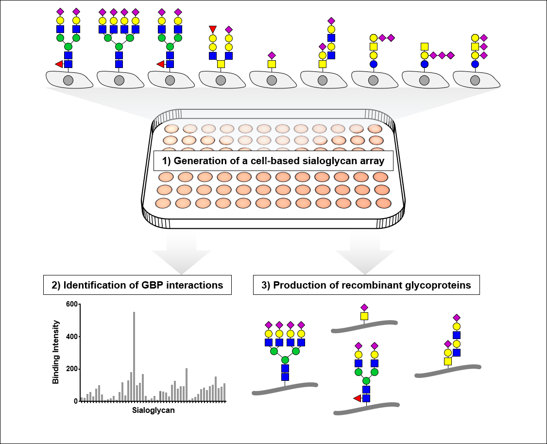 First, precise genome editing was used for rational combinatorial gene knock-out (CRISPR/Cas9) and knock-in (Zinc Finger Nuclease) of glycosyltransferase genes involved in the biosynthesis of sialoglycans in human embryonic kidney cells (HEK293) to produce a library of stable isogenic cells each lacking/displaying a specific feature of the Sialome. The cell library was validated genetically and the glycan phenotypes were confirmed with probes specific for sialoglycans. For example, by combinatorial knock-out and knock-in of the sialyltransferase isoenzymes a panel of isogenic cells was generated that allow now study of the specific functions of the 20 sialyltransferase isoenzymes. Second, the cell-based glycan array was used in high-throughput cell-based assays such as automated flow cytometry to dissect the binding specificity of sialoglycan-binding receptors in the natural glycan context of living cells. Novel insights into the binding specificity of the human immunomodulatory Siglec receptors and the underlying essential glycosyltransferase genes and biosynthetic steps were obtained. In particular, undescribed high selectivity of individual Siglecs for distinct sialoglycans was discovered. Third, using the cell-based glycan array resource, a panel of recombinant glycoproteins with customizable and homogenous sialoglycan decoration was produced. Binding studies using this panel revealed contribution of the protein backbone as determinant for highly specific recognition of sialoglycans for example by Siglecs.
