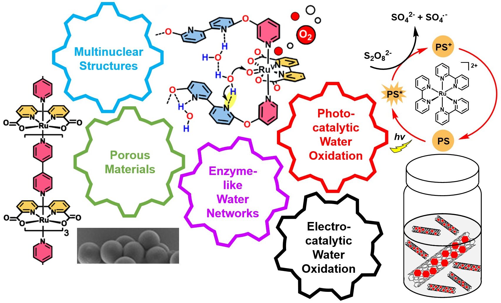 In addition to these structural accomplishments that established an entirely new class of metallosupramolecular architectures, the SUPRAWOC project provided important insights into the role of water networks around and between the catalytically active Ru(bda) units for rapid proton-coupled electron transfer steps as required for the WNA mechanistic pathway. These insights enabled us to accomplish a major breakthrough, the design of a single-site Ru(bda) catalyst surrounded by an enzyme-like pocket that pre-organizes water molecules for rapid proton-coupled electron transfers, matching the performance of the tetramanganese cluster utilized by plants in natural photosynthesis (Nature Catalysis 2022).