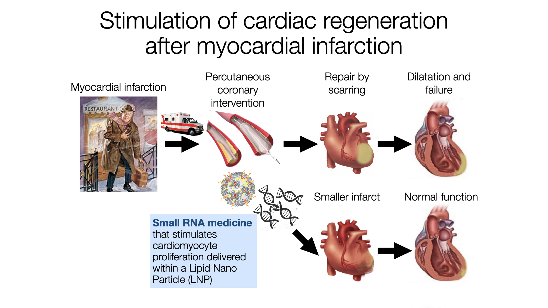Based on this information, we tested the efficacy of the same molecules at stimulating cardiac regeneration after myocardial infarction first in mice and later in pigs. We delivered the genes coding for the microRNAs using viral vectors based on the adeno-associated virus (AAV), which target cardiomyocytes efficiently, and found that two of the microRNAs were very effective at stimulating cardiac regeneration in mice and one also in pigs. To progress towards clinical translation of these findings, next we explored the possibility of administering these small RNAs as synthetic molecules, the effect of which can be modulated by chemical modification to last 2-3 weeks and then disappear (expression is instead permanent using AAV vectors). We explored the efficacy of over 40 different lipid nanoparticle (LNP) formulations, obtained using the same technology as the COVID-19 vaccines from BioNTech/Pfizer and Moderna, for cardiomyocyte-specific RNA delivery, and eventually identified an LNP that is particularly effective. Using this LNP, we confirmed that all the four identified pro-proliferative miRNAs induce cardiac regeneration in mice and that two of them (miR-199a-3p and miR-1825) are also effective in pigs.