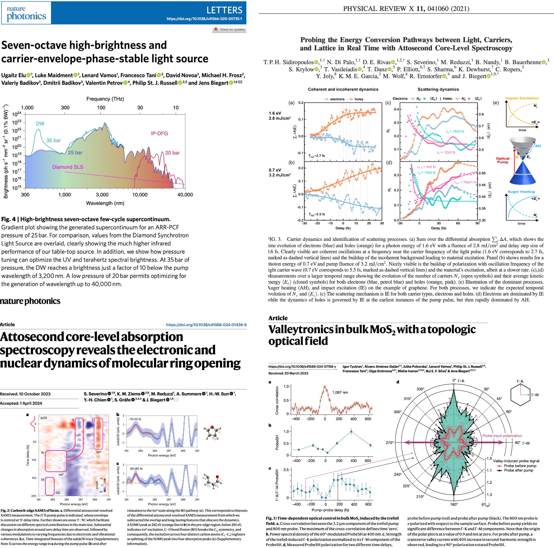 O3 saw remarkable progress. We employed attosecond X-ray and harmonic spectroscopy to disentangle electronic and structural phase transitions in solids. Highlights include optical imaging of quantum phase transitions in high-Tc superconductors and the first lightwave control of a topological phase transition, leading to valleytronics independent of material properties. This work resulted in a patent application for a novel method in valleytronics in bulk materials(EP23382921.7).