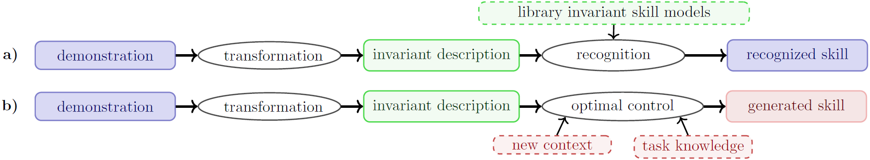 To this end, Robotgenskill addressed the following research question: how can a robot generalize a skill that has been demonstrated in a particular situation and apply it to new situation? Robotgenskill focused on skills involving rigid objects manipulated by a robot or by a human, and followed a model-based approach consisting of: (1) extracting an invariant skill representation from the demonstration data; (2) creating a new instance of the skill for a new situation by solving an optimal control problem in which similarity with the invariant representation is maintained while complying with the constraints imposed by the new context. This approach stands in contrast with mainstream AI approaches, which are purely data-driven and hence do not use physics-based models.