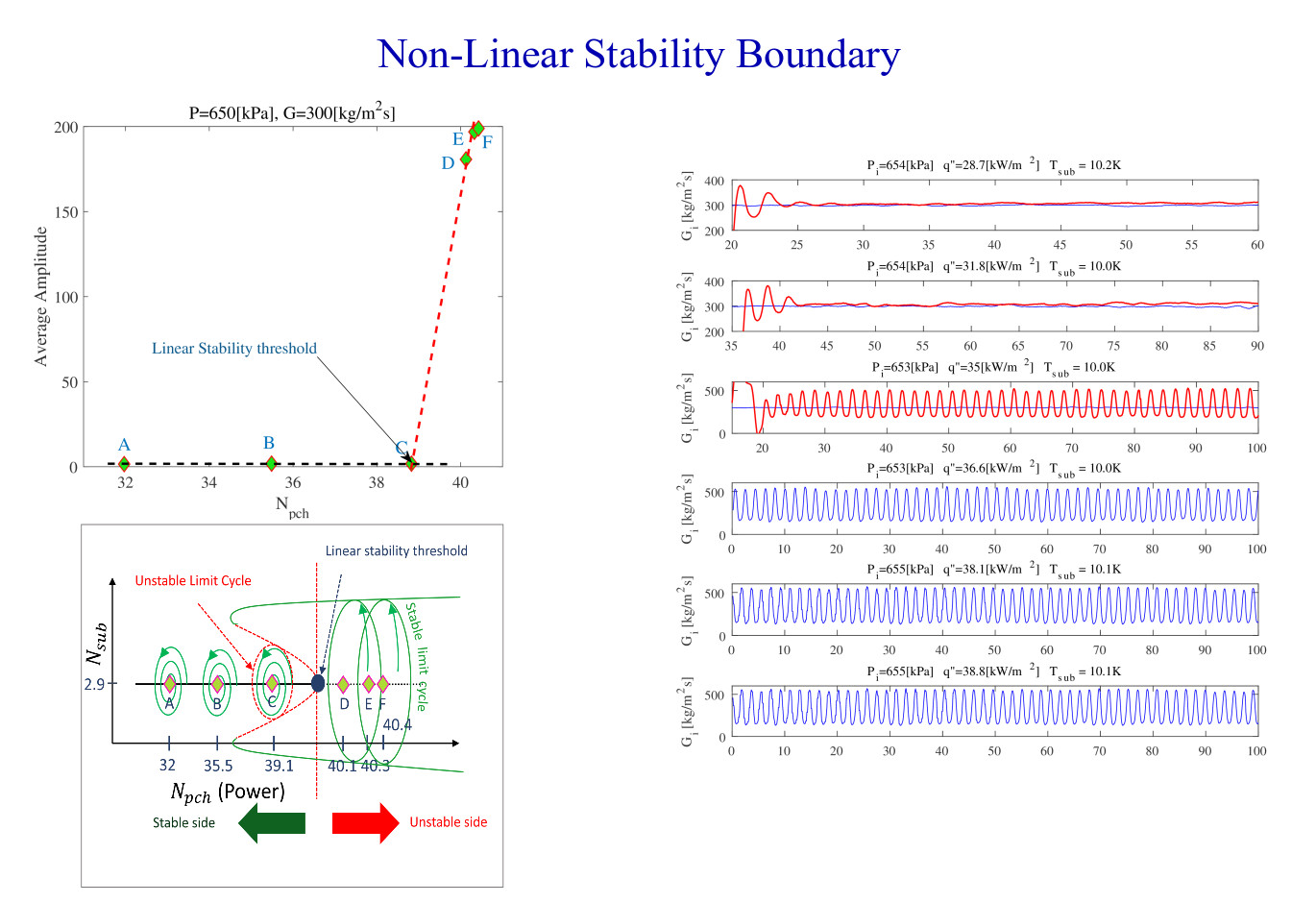 3. The existing approach of finding the stability thresholds experimentally during the density wave oscillations need to be revised. Contrary to the existing approach where the applied powers are increased in steps and the oscillation amplitudes are recorded, it is proposed that at every applied power, one should apply a high perturbation to the flow rate and observe the oscillations behavior. If the oscillations die, then the corresponding working conditions should be noted as stable. Elseif the oscillations do not die, the working conditions should be treated as unstable.