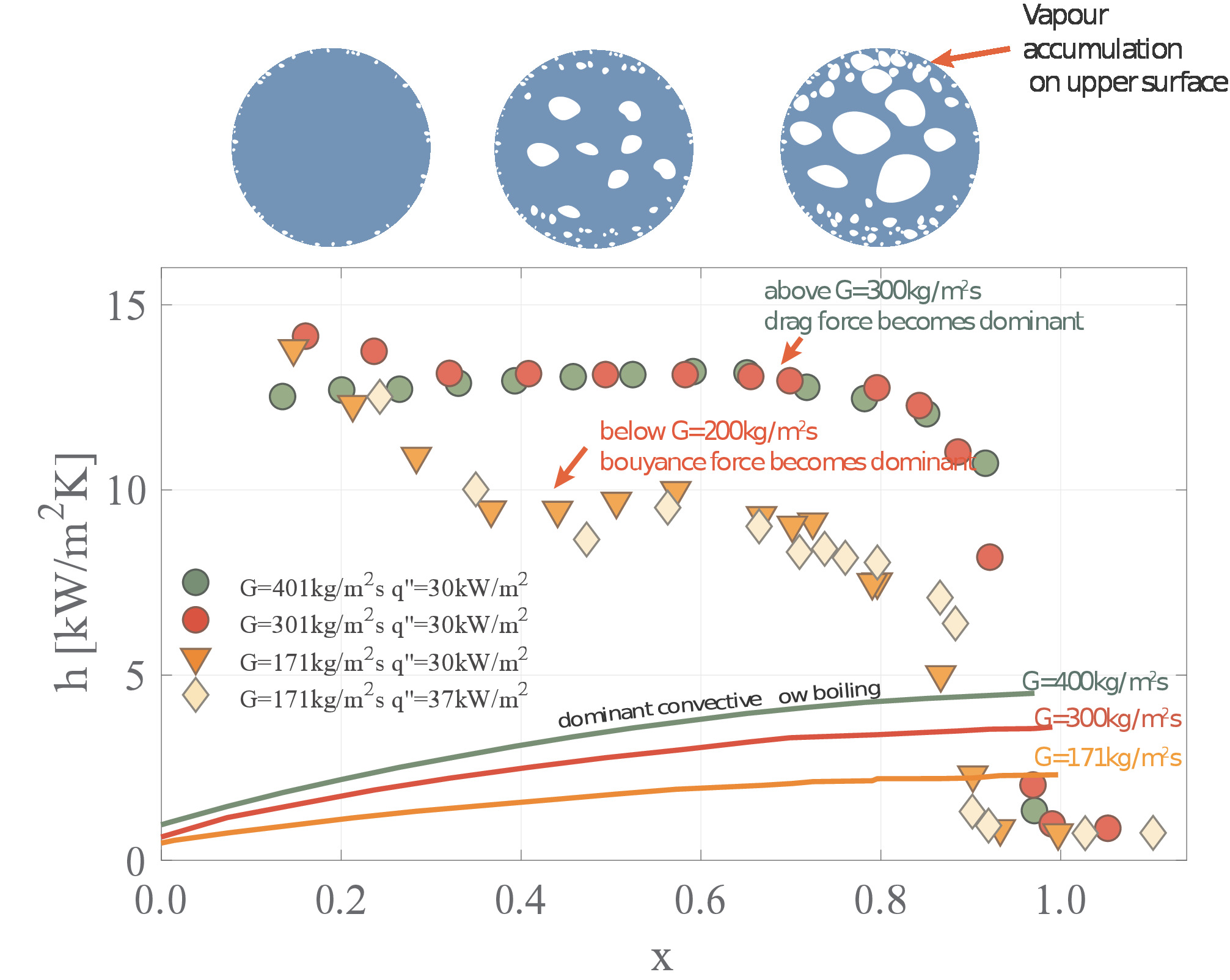 2. To achieve an optimum nucleate boiling heat transfer process, the flow velocity or flow rate must be above a certain threshold. Below the threshold flow velocity, the surface re-wetting process is limited and thus the heat transfer rates can not be enhanced.