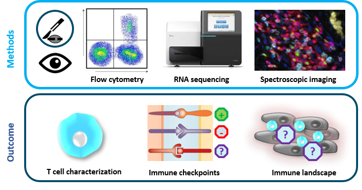 The aim of my project was to use multiple approaches to unravel the immune landscape in UM, including RNA sequencing and spectroscopic imaging, focussing both on the tumor cells and immune cells. Among others, analyses revealed immune checkpoint expression and immune cell subset presence within the tumor microenvironment. Culture of tumor-infiltrating lymphocytes to be tested for tumor reactivity in autologous models was impeded by the very small tumor biopsies leading to an adjusted approach with fresh tissue analysis obtaining extended data on the immune landscape in primary UM. These data can be used for the development of data-based-hypothesis to overcome immune escape mechanisms specific for UM. In addition, clinical data of approximately 100 patients with metastatic UM were analyzed, showing a low but clinically relevant response rate to combined ICI. These results, together with a second publication from a different research group, impacted the current choice of treatment in patients with metastatic UM in multiple countries.