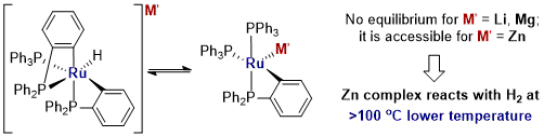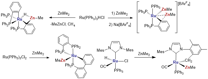 Attempts to perform a variety of catalytic transformations with the synthesized Ru-Zn complexes were not fruitful. Following the research risk and contingency plan, FMM focused on the synthesis of other types of heterobimetallic compounds. He developed protocols for novel complexes bearing unconventional Ru-Zn2 and Ru-Zn4 units and studied the reactivity of these systems. Finally, FMM directed studies toward other Ru–M complexes. The first of the metals in each of groups 13 (M = Al) and 14 (M = Sn) were selected for further investigation, and synthetic protocols for the synthesis of corresponding compounds were developed.