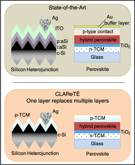 Two solar cell technologies, silicon heterojunction (SHJ) and perovskite solar cells (PSCs), will be used as testing grounds for the new p-type TCMs developed in the proposed work. These technologies were chosen for maximum impact. SHJ cells have reached record efficiencies >25%, while costing less to produce than more complicated interdigitated back contact (IBC) designs. Meanwhile, PSCs have rocketed up the efficiency chart reaching 22.1% in less than five years. However, both technologies suffer from their own bottlenecks. SHJ cells are still not commercially competitive with lower-efficiency homojunction designs, due to complex multi-layer front contacts that drive up capital expenditure and result in optical losses in the amorphous silicon buffer layers. PSCs are notoriously unstable, leading to addition of various protective coatings, but at the expense of parasitic light absorption and increased process complexity. Both problems share the same solution: a single p-type TCM to act as both front current collector and junction partner, thus simplifying cell processing and eliminating parasitic absorption. CLAReTÉ will develop a new class of p-type TCMs to meet this need, guided by design principles for identifying materials with superior p- type electrical transport properties. CLAReTÉ will generate cross-cutting scientific impact by (a) taking an integrated materials science approach in which high-throughput materials screening is coupled to cutting-edge solar cell fabrication, (b) testing novel design principles proposed for p-type TCMs under real-world conditions, and (c) uncovering new high-performance p-type TCMs with applications in modern technologies ranging from PV to consumer electronics.