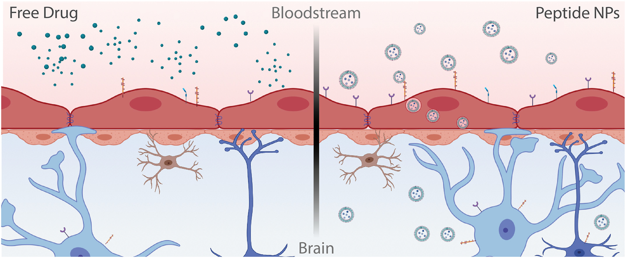 3.We have in deep investigated the mechanisms of transport across the BBB to the brain. To this aim we have used NPs with tunable amounts of ligands to a receptor present in the BBB used for transferring molecules from the blood to the brain side. We have elucidated the role of key actors (proteins) on the transport, and our findings show how depending on the amount of ligands used we can biase toward internalization in the cells and fast degradation and therefore no shuttling across, or a fast shuttling across the BBB. This is particularly relevant for the design of NPs to deliver drugs inside the brain for tumor treatments.