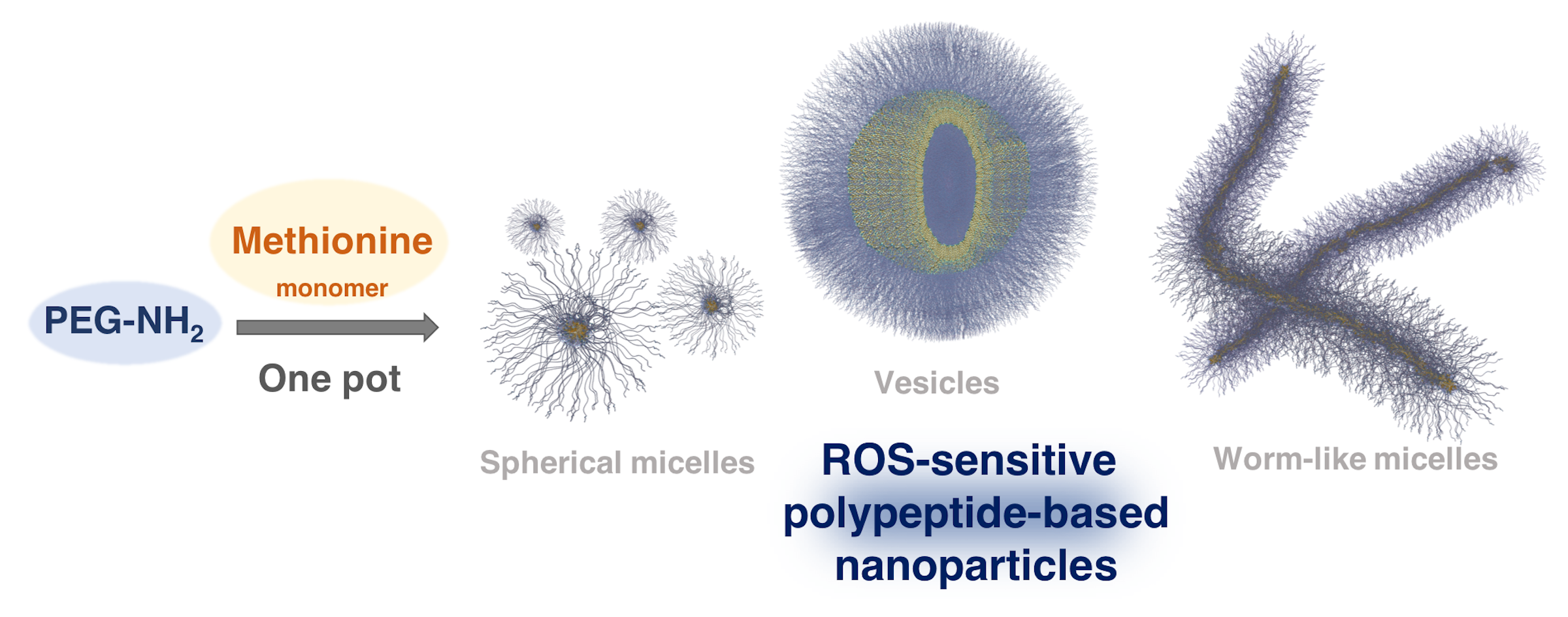 1. Demonstrate a facile and well-controlled synthesis of defined NPs morphologies using biocompatible, biodegradable and stimuli-responsive polypeptides as building blocks, which can be useful as drug delivery systems in a myriad of biomedical applications. Our strategy is highly significant and brings a new perspective to biodegradable NPs one-pot production based on poly(amino acids), particularly but not exclusively for application in the healthcare sector. Furthermore, the ROS-responsiveness and disassembly of our nanoparticles (that we monitor in situ thanks to LTEM) provide them with the ability to trigger their functional output under diseased/malfunctioning sites linked to mitochondria dysfunction. This is especially relevant in many pathologies including atherosclerosis, neurodegeneration, arthritis, diabetes, inflammation, cancer and metastasis where ROS is overproduced.