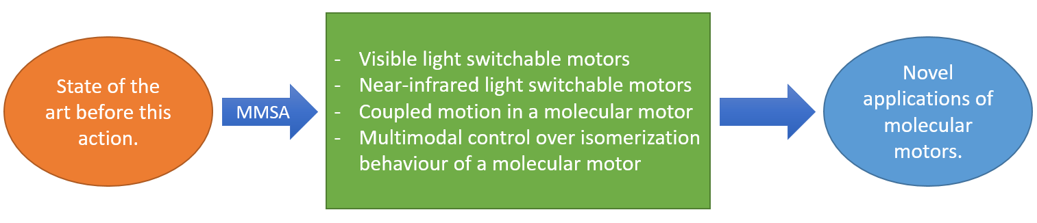 The impact of this action on the scientific community is therefore significant, given its two-year duration. The obtained results are set to be the basis for exciting future research in the host group but also in the wider community, opening up new avenues for the design and application of molecular machines. Especially our newly developed strategies for obtaining near-infrared light sensitive motors will form a basis for the development of molecular motors suitable for in vivo applications. Coupled motion is a central aspect for the creation of more advanced molecular machines, and our new compound displaying this kind of behaviour which can furthermore be conveniently operated using visible light is an ideal candidate to apply in future studies towards this goal. Finally, being able to switch the mode of operation of a nanoscale light-driven machine by alternating its environment is an interesting basis for the creation of materials whose properties can be controlled by multiple orthogonal stimuli.