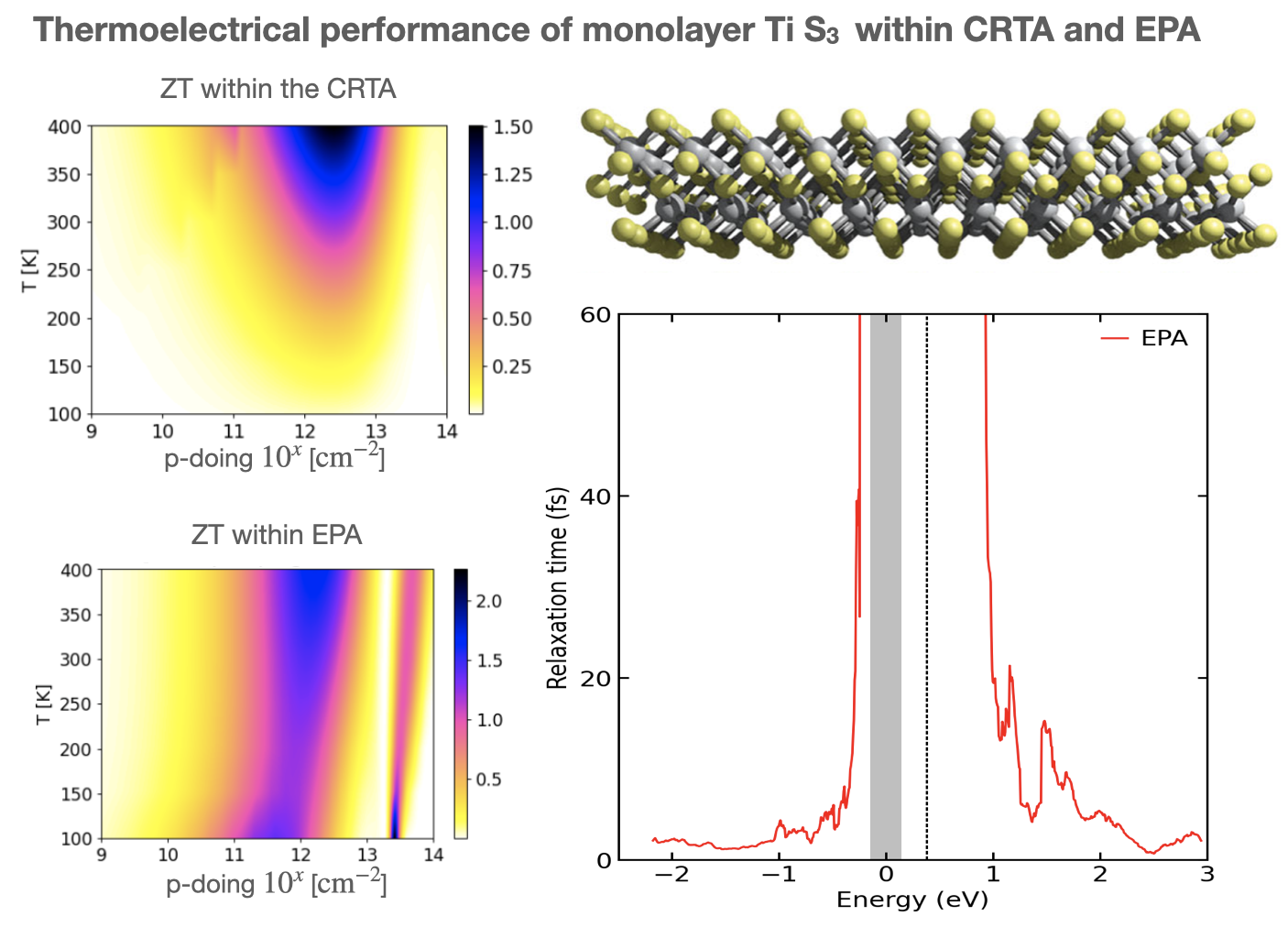 1. Realisation of state-of-the-art ab initio calculations of the thermal and electronic transport properties of 2D-layered Transition-Metal Trichalcogenides (TMTs), especially investigating the influence of electron-phonon interaction onto the thermoelectrical properties. We found that electron-phonon interaction drastically changes the thermoelectrical properties of 2D TMTs and need to be considered. Standard approximation for bulk materials as the constant relaxation time approximation or the estimation of the relaxation time via deformation potential cannot be applied for low-dimensional materials.