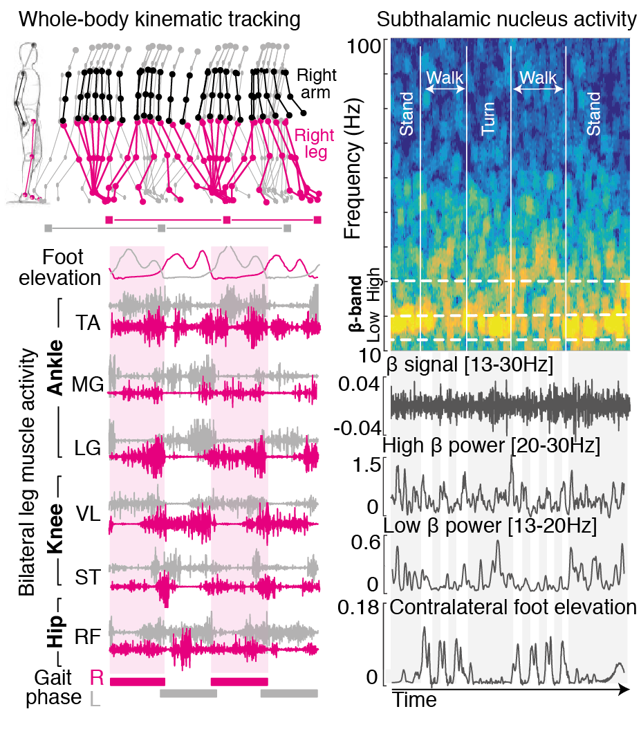 To address this knowledge gap, project gaitDCODE established a high-resolution tracking platform at the Lausanne University Hospital, endowed with unique equipment for recording and modulating gait wirelessly and in real-time, in order to map the activity of subthalamic nucleus onto kinematic, kinetic, and muscle activity patterns while patients execute a range of activities of daily living. We further established the analytical concepts and methodologies necessary to identify and extract robust features representative of gait deficits from the high-dimensional, time-varying biomechanics that govern locomotion. Jointly, this approach allowed to record and link brain and locomotor states with a level of detail not yet shown in Parkinson's disease.