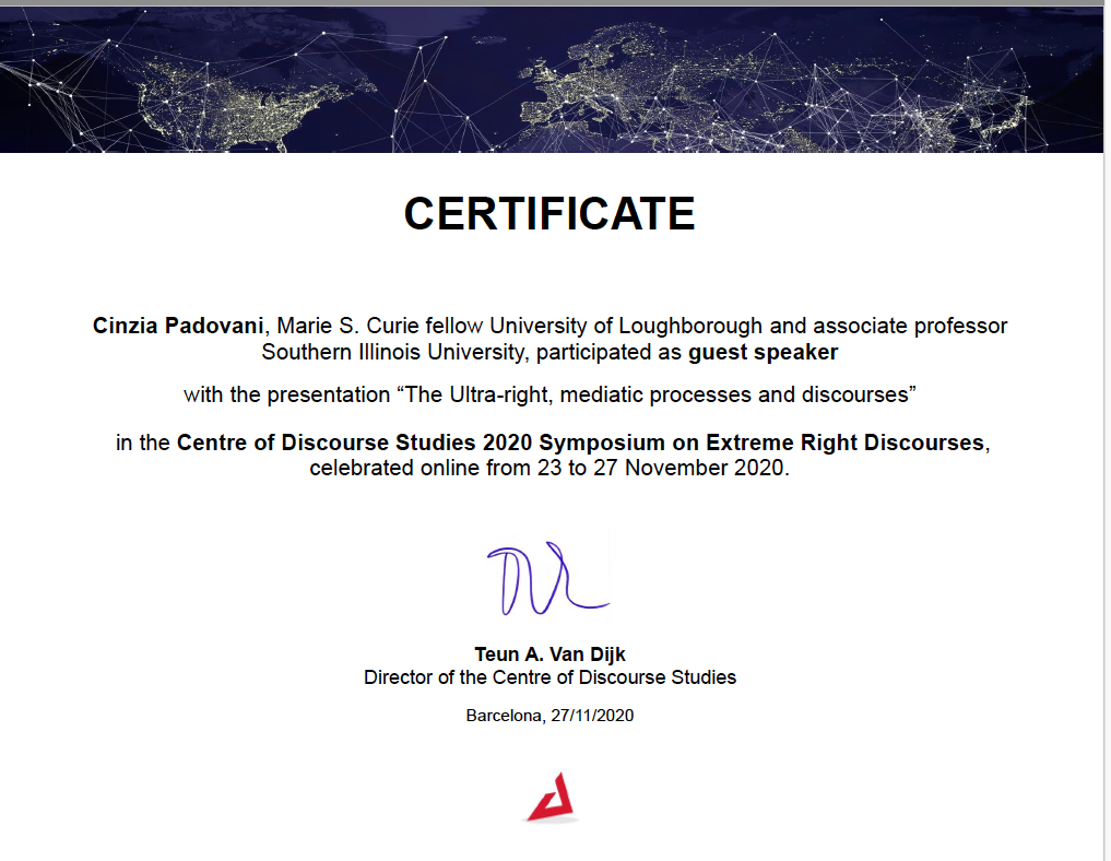 Invited talks, including at the Centre for Social Media Research, Scuola Normale Superiore, Firenze, 15/12/20; Centre of Discourse Studies, Extreme Right Discourses Symposium, 23-27/11/20; School of Social Sciences and the Humanities, University of Loughborough 20/11/20; Cardiff School of Journalism, Media and Culture, 11/11/20; University of Groningen, 23/04/19; and a panel on journalism and the extreme right organized the European Communication Research Association and International Association for Mass Communication Research, Madrid, 7-11/07/19.