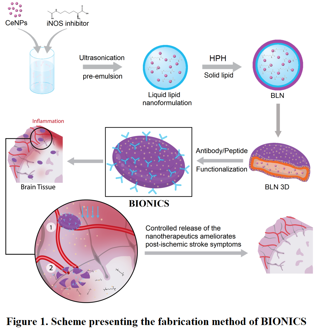 Based on these results and aiming at making our system more biomimetic, I proceeded in the fabrication of nanocapsules made from commercially available lipids extracted from a porcine brain. The brain lipids were used as a lipid-matrix able to encapsulate nanoceria and the aforementioned specific inhibitor LNIL (LNIL-Ce-BL). This time we attached on the surface of the fabricated LNIL-Ce-BL nanocapsules two different peptides, and we studied if they facilitate their uptake by the cells of the BBB and the neuronal cells. From the tested peptides, only the so-called T7 and angiopep-2 peptides showed to improve the internalization of the nanocapsules. The antioxidant ability was also tested, and it was found that BIONICS (LNIL-Ce-BL-T7) (Figure 1) act better than free nanoceria or LNIL acting by themselves. The in vitro preliminary data (experiments with cells) presented an enhanced therapeutic effect of BIONICS, compared to the control untreated cells or cells treated only with nanoceria or LNIL. It has to be noted that the therapeutic effect of BIONICS against oxidative stress, as well as the level of neuroprotection that BIONICS can offer, was assessed under a modified ischemia/reperfusion model reported in another study. The data showed that BIONICS could reduce oxidative stress derived from overproduced reactive oxygen and nitrogen species, and can protect both the endothelial cells of the BBB as well as the neuron-like cells from dying.