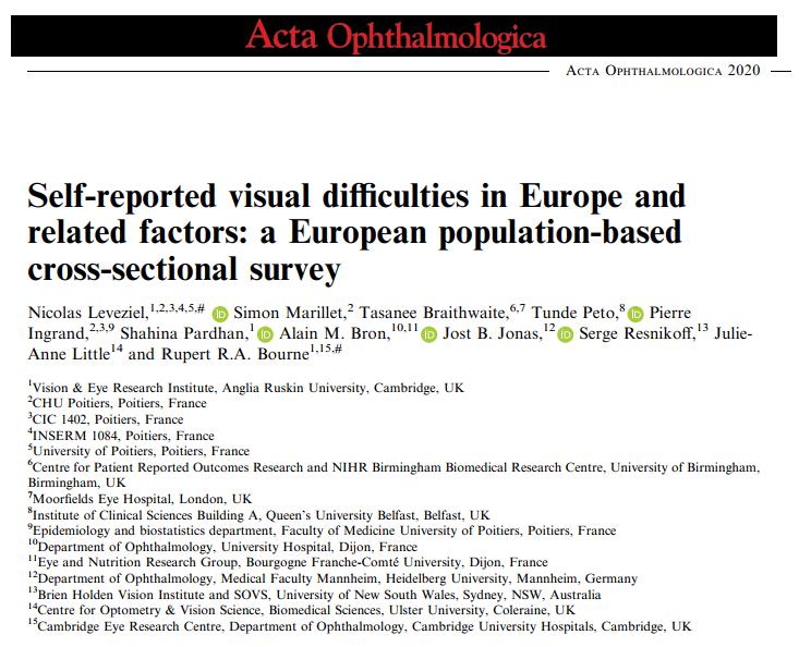 - 1 article accepted in an international journal in 2020 (Acta Ophthalmologica): Self-reported visual difficulties in Europe and related factors: a European population-based cross-sectional survey