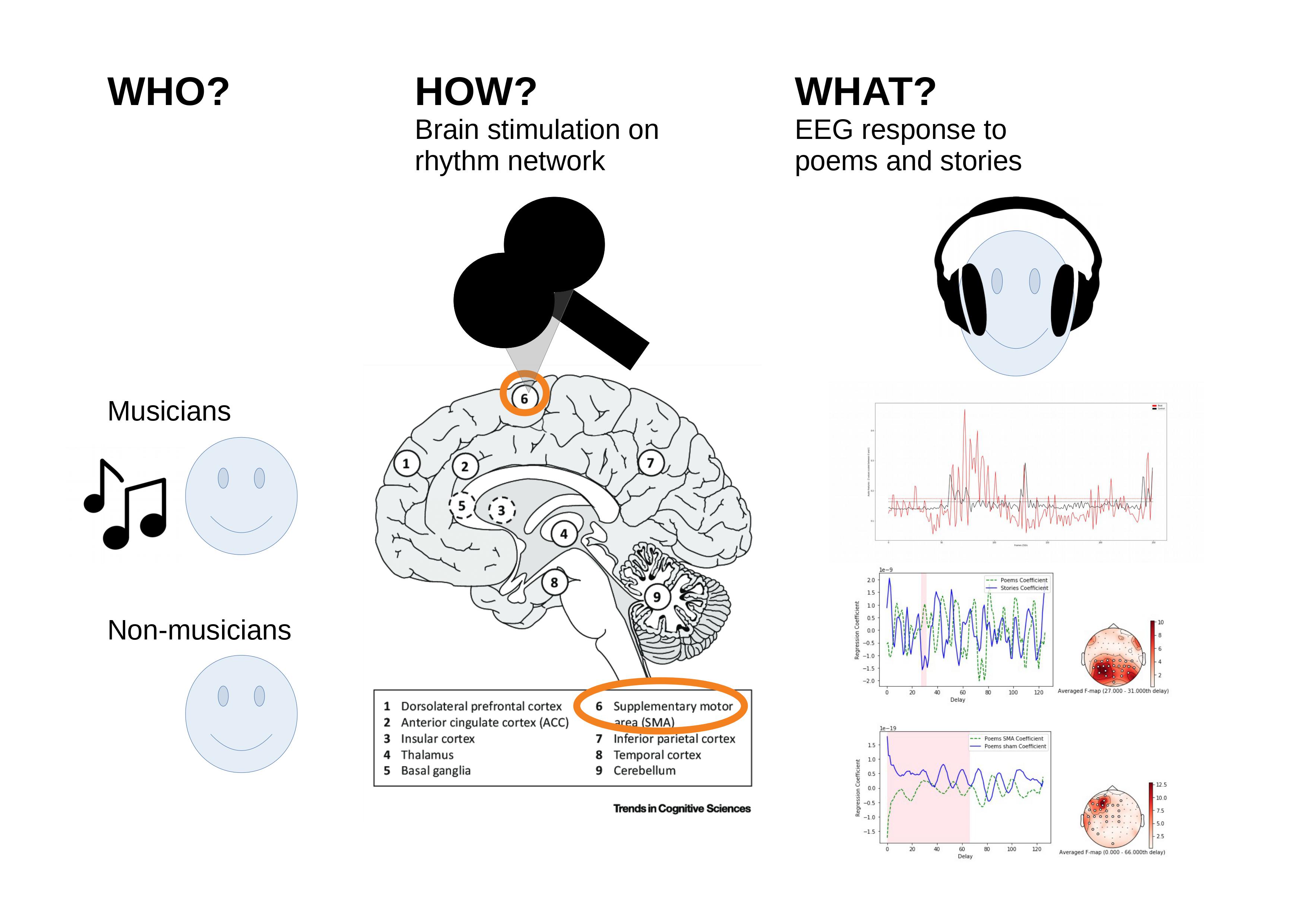 Based on the preliminary analysis of 9 non-musician datasets, findings suggest that down-regulating activity of the supplementary motor area (SMA) with TMS affects processing of regular rhythm in poems. More datasets in both the musician and non-musician populations will reveal whether this effect is significant and whether musicianship interacts with this TMS-induced effect.