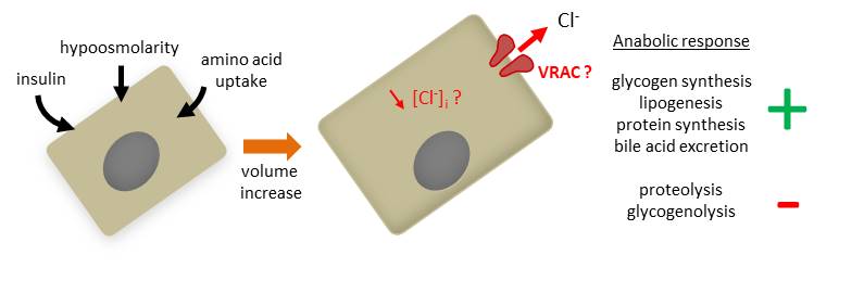 Because the liver is a key organ controlling lipid and carbohydrate metabolism, dysregulations of hepatic signaling pathways can lead to metabolic diseases. If some cascades are identified as regulated by VRAC, this channel may therefore represent an interesting therapeutic target for the treatment of metabolic diseases such as the non-alcoholic steatosis hepatitis (NASH).