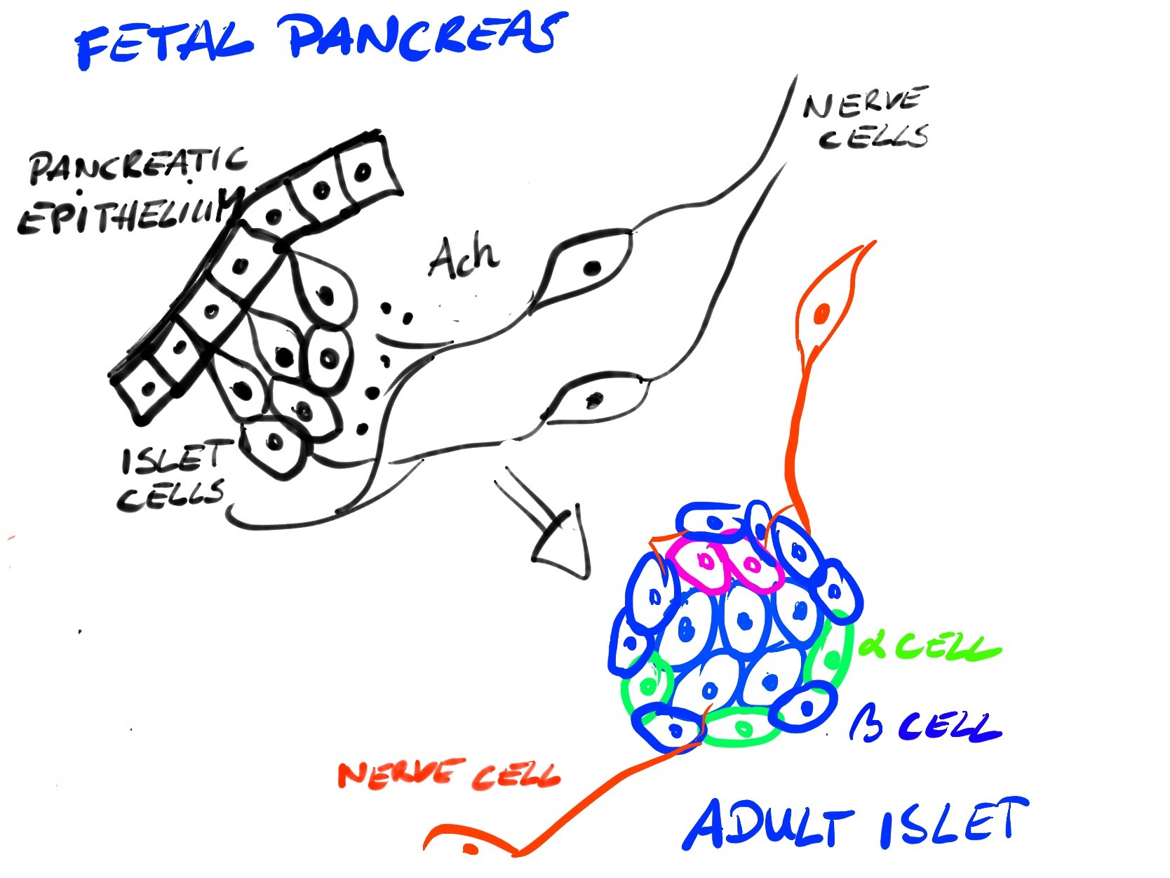 These results show that nicotine is affecting beta cell function after long-term in vivo treatment (similarily to smoking), most likely by impairing communication between nerve and beta cells. A hypothesis further supported by our related finding that blocking nicotinic signaling during beta cell development is impairing the formation of beta cell clusters and connection to nerve cells (see figure).
