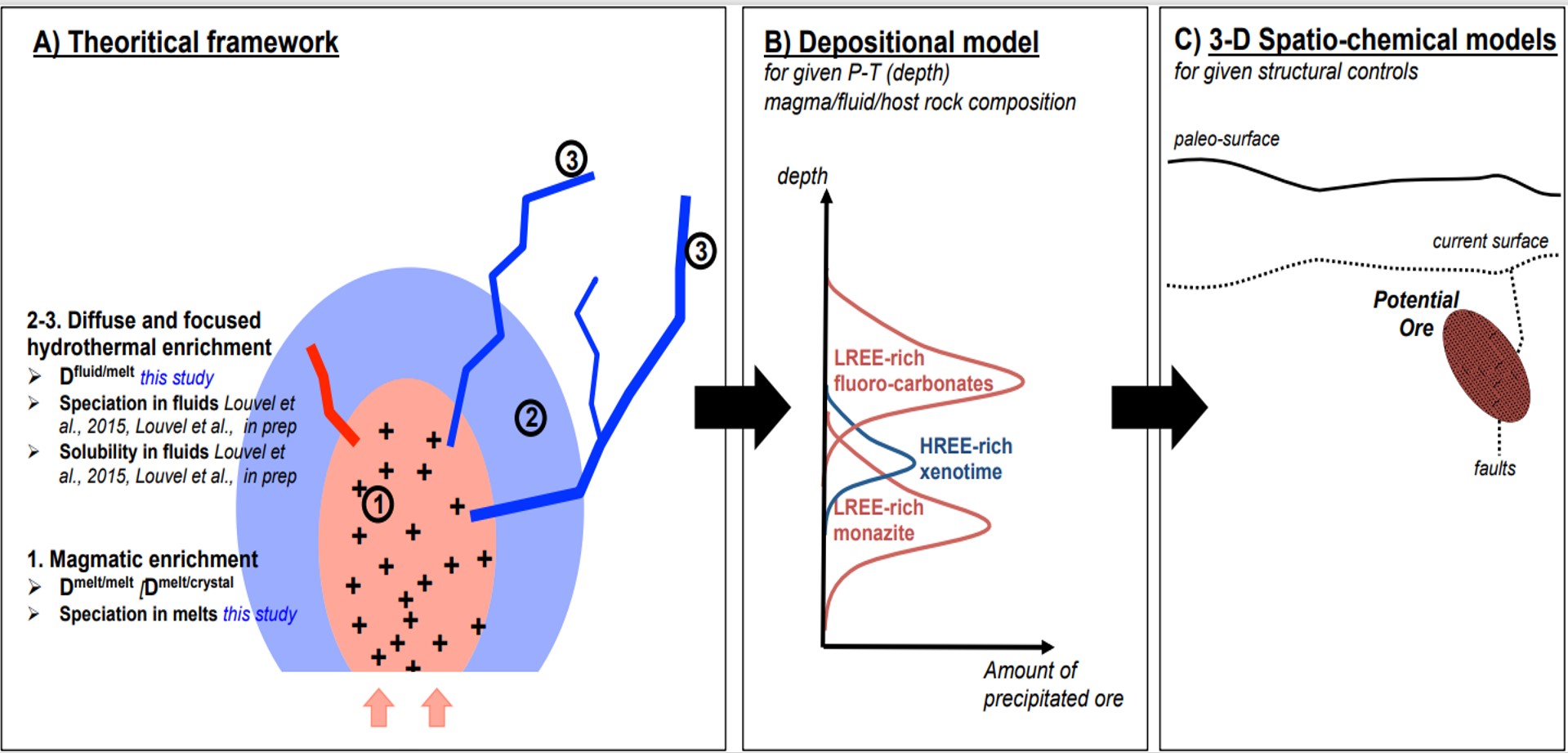 In a very schematic way, the enrichment process leading to the concentration of REE up to economic grade can be divided into 3 phases: (1) a magmatic enrichment phase that involves fractional crystallization of carbonatite, syenite or granite melts, (2) an hydrothermal enrichment phase that involves high-temperature fluids that mobilized and transport the REE out of their magmatic host minerals and reprecipitates them as newly enriched minerals in the magmatic intrusion or the host rocks and (3) a weathering phase where low-temperature meteoritic fluids can further concentrate the REE, especially in ion-adsorption clays.