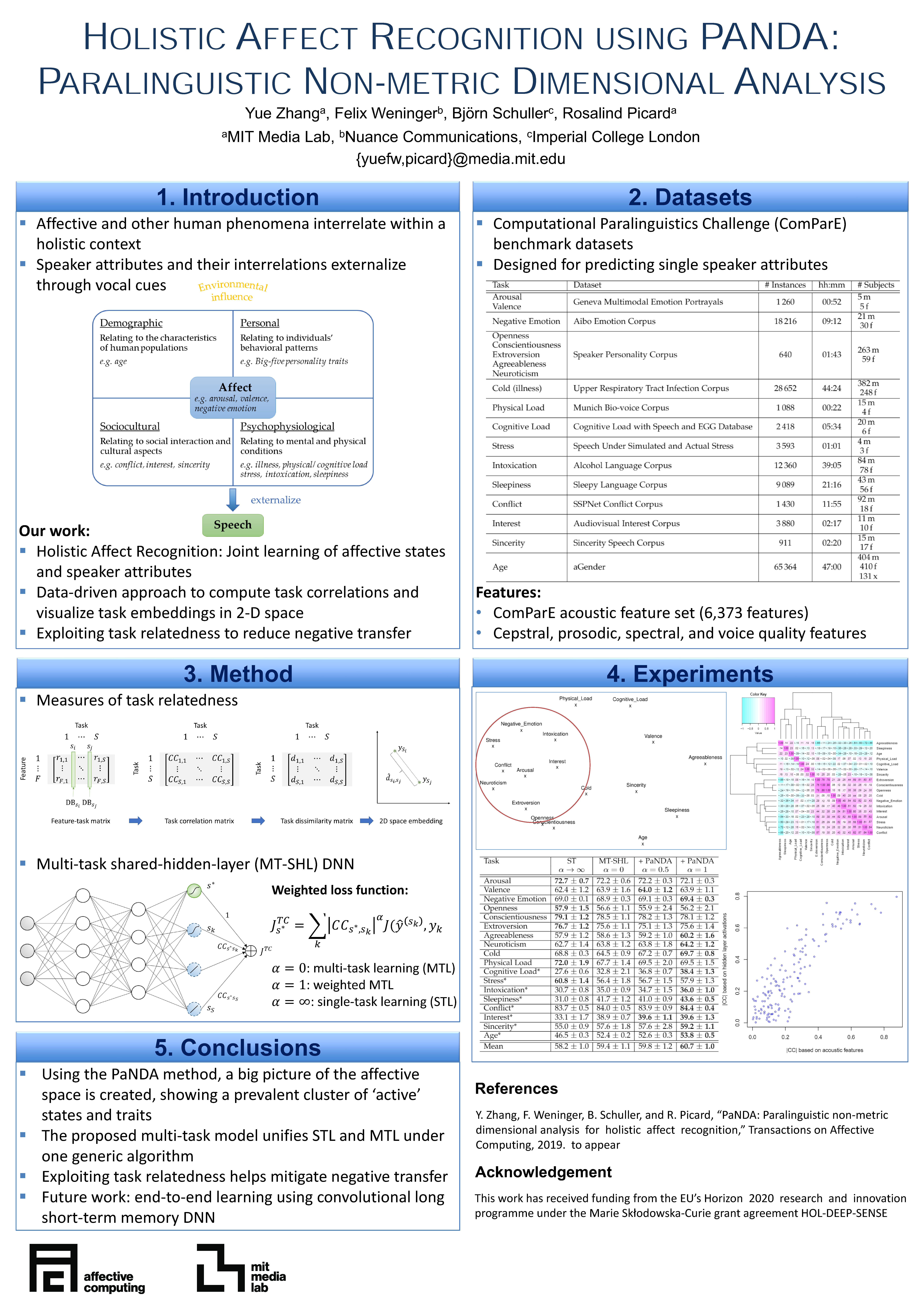 In the published paper "PaNDA: Paralinguistic Non-metric Dimensional Analysis for Holistic Affect Recognition", a total of 18 speaker attributes are learned together: Negative emotion, age, interest, intoxication, sleepiness, Big-five personality traits (Openness, Conscientiousness, Extroversion, Agreeableness, Neuroticism), conflict, arousal, valence, cognitive load, physical load, sincerity, cold, and stress. Detailed explanation of the approach and discussion of results can be found in the open access publication of the paper (https://dspace.mit.edu/handle/1721.1/123806(opens in new window)) as well as on the project webpage (https://www.media.mit.edu/projects/hol-deep-sense/overview/(opens in new window)).