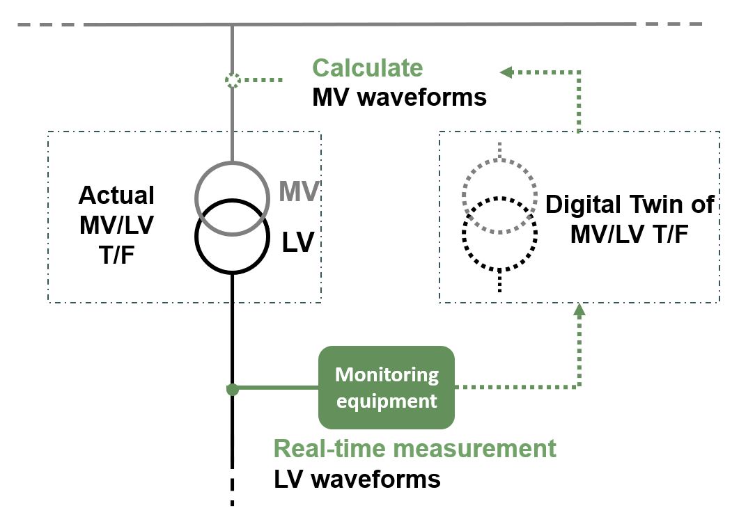 - The MV-side waveforms outputted by the digital twin of the T/F are as accurate as the measurements of an instrument T/F (which are a particularly constly topology used to the day) on the MV side of the actual T/F,