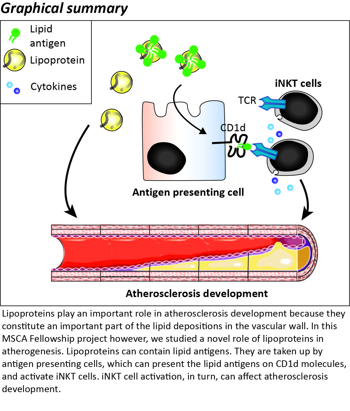 Since circulating lipoproteins routinely contain lipids that are structurally similar to lipid antigens, I hypothesized that circulating lipoproteins would also contain lipid antigens for iNKT cells. I developed CD1d-sortagging as a novel and innovative approach for lipid antigen identification. CD1d-sortagging employs bacterial sortase enzymes for site-specific cleavage and biotin labeling of CD1d-lipid antigen complexes, followed by isolation and potentially identification of the lipid antigens. Using CD1d-sortagging and state-of-the-art microscopy techniques, I have been able to show that circulating lipoproteins can indeed contain lipid antigens for iNKT cell function. Furthermore, I discovered that the containment of lipid antigens in lipoproteins affects iNKT cell function. Finally, I showed that manipulation of lipoprotein metabolism impacts the delivery of lipid antigens to antigen presenting cells, and thereby the function of iNKT cells. In conclusion, the MSCA Fellowship project showed that lipoproteins are not only involved in plaque development as lipid deposits, but also play a role in the activation of iNKT cells.
