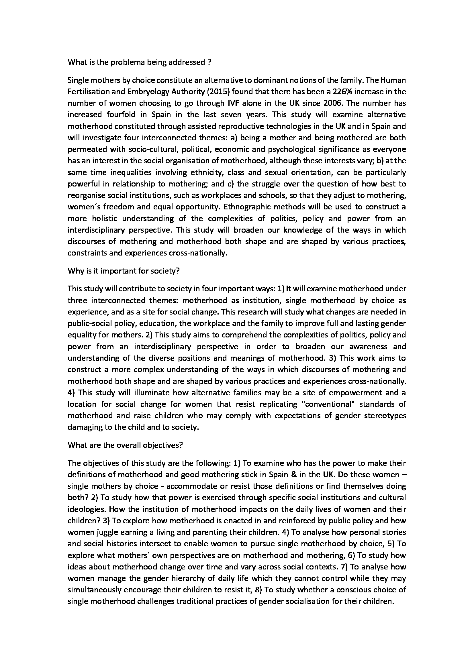 The objectives of this study are the following: 1) To examine who has the power to make their definitions of motherhood and good mothering stick in Spain & in the UK. Do these women – single mothers by choice - accommodate or resist those definitions or find themselves doing both? 2) To study how that power is exercised through specific social institutions and cultural ideologies. How the institution of motherhood impacts on the daily lives of women and their children? 3) To explore how motherhood is enacted in and reinforced by public policy and how women juggle earning a living and parenting their children. 4) To analyse how personal stories and social histories intersect to enable women to pursue single motherhood by choice, 5) To explore what mothers´ own perspectives are on motherhood and mothering, 6) To study how ideas about motherhood change over time and vary across social contexts. 7) To analyse how women manage the gender hierarchy of daily life which they cannot control while they may simultaneously encourage their children to resist it, 8) To study whether a conscious choice of single motherhood challenges traditional practices of gender socialisation for their children.