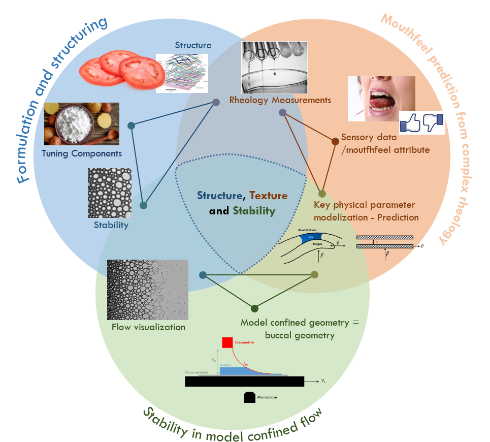 To get better insights on fundamental aspect such as the stability of these emulsions towards realistic flows (WP2), we investigated as a first approach, model emulsion undergoing squeezing flow, similarly to what happens during a swallowing process. Our results show that these model o/w emulsions destabilize because of internal rearrangements of droplets (creeping) in addition to the drainage of the continuous phase due to the squeezing motion. These findings allow for a deeper understanding on how to prevent destabilization of more complex emulsions (e.g. MCF emulsions) in realistic situations such as transport of emulsion or human swallowing.