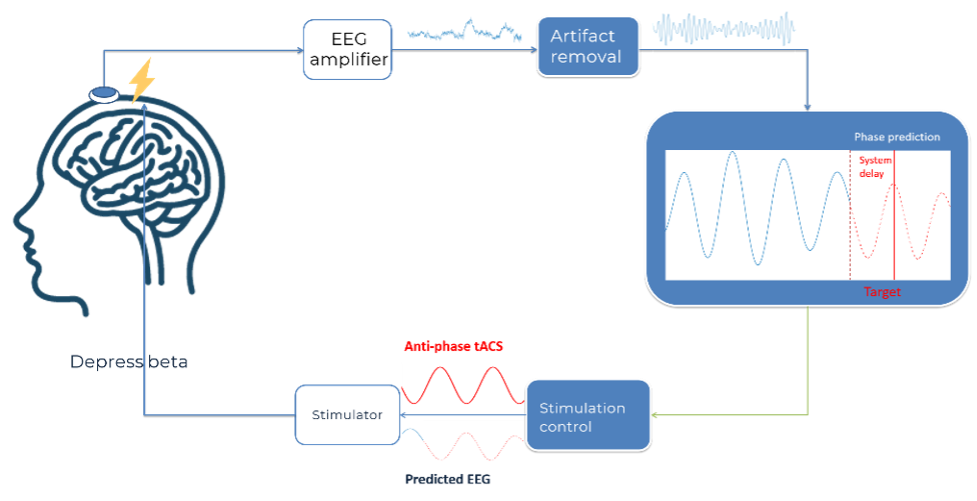 In WP3 we developed a platform for recording on-going brain activity and initiating stimulation based on features of this activity. This was a technically challenging project calling for accurate prediction of the brain activity into the future as well as a very short delay between the determination of the desired starting point and the stimulation onset. After many iterations we have achieved a set-up with a high accuracy (~70% with a narrow error range) and short delay (13ms). Currently, we are comparing the performance the stop-signal task when we provide stimulation that is in-phase with the on-going brain activity (enhancing the on-going activity) with anti-phase stimulation (disrupting on-going activity). We expect that stop-signal task performance will decrease with the anti-phase stimulation.
