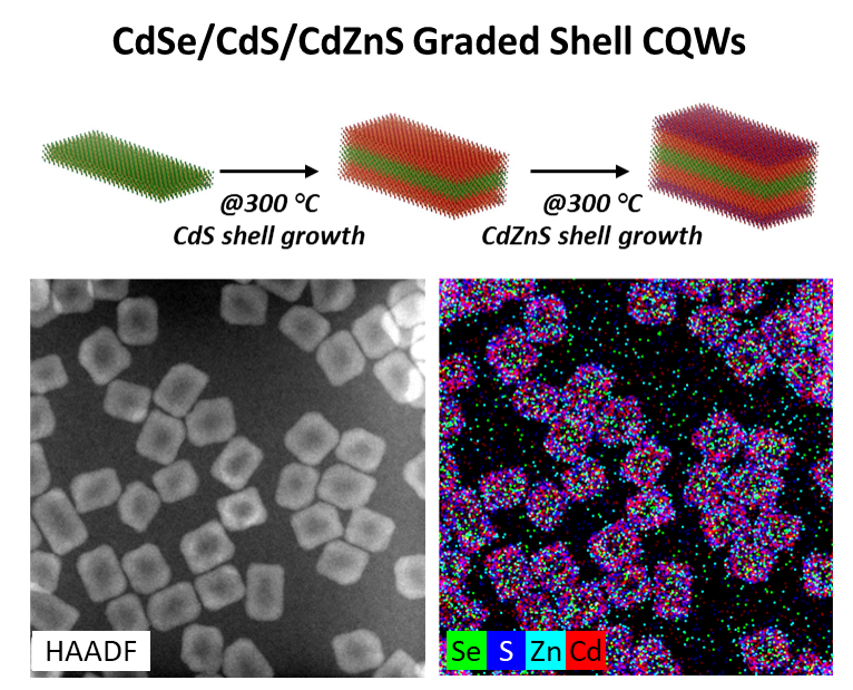 - Synthesis of CdSe/CdS/CdZnS core/graded shell CQWs showing significantly improved optical properties including enhanced PLQY (up to 89%) and narrow emission linewidth (down to 21 nm).