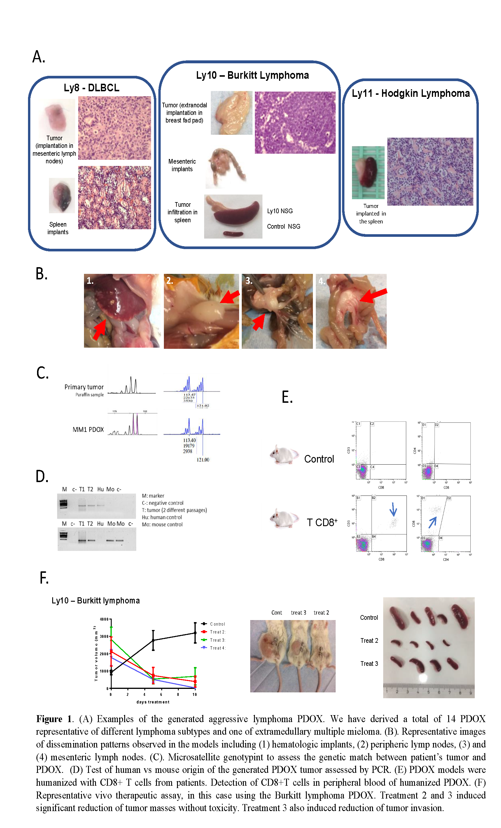 During this project we have developed the technology to generate 14 advanced PDOX for aggressive B and T lymphomas. These models are representative of different lymphoma histologies, including diffuse large B cell lymphoma, adult Burkitt lymphoma EVB negative, Hodgkin Lymphoma, Primary cutaneous large B-cell lymphoma leg type, Marginal zone B-cell lymphoma and angioimmunoblastic T-cell lymphoma. The tumor take rate obtained was 52%, as we implanted a total of 27 lymphomas. Additionally, we have generated one PDOX model of extramedullary multiple myeloma (EMM) from two EMM implanted. Growth rates (time between tumor passages), were between two to four months, with the exception of the Burkitt lymphoma model and the EMM model that showed a rapid growth, with a period between passages of three to four weeks. PDOX have been generated in NOD.Cg-PrkdcscidIl2rgtm1Wjl/SzJ (NSG) mice that are the most immunosuppressed murine models available. To humanize them with human immune system, we have tested several strategies. Initially we used peripheral blood mononuclear cells (PBMC) separated from blood samples but quantity of PBMC obtained from patients was insufficient and they generated graft versus host disease (GvsHd). Finally, we have adopted the humanization with CD8 + T lymphocytes expanded ex vivo and depleted of CD4+ T cells. Phenotypic and genetic matching between PDOX and precursor patient’s tumor were checked by histology comparison, test of surface cell markers and by genetic genotyping using six different microsatellite markers. Genetic characteristics of tumors were studied using new generation sequencing approaches (panels and/or exome sequencing) and fluorescence in situ hybridization (FISH). For the therapeutic studies, the tumors were firstly expanded in 3 to 5 animals and then reimplanted in a minimum of 8 animals for each experimental group. The experimental groups were defined together with the clinicians responsible for the patient. Only those drugs or combinations that were possible to be administered to the patient were included and adapted o experimental model to control toxicity. Results of in vivo therapeutic assays were communicated to the hematologist responsible for the patients to support therapy decisions. The project results are submitted and in preparation for publication in open access journals. Four other collaborative papers were published also in open access journals, two in Nature Communications and other two in Plos Neglected Tropical Diseases. At the end of this fellowship I was hired as principal investigator of the Catalan Institute of Oncology (ICO) / Bellvitge Biomedical Research Institute (IDIBELL) where this project has been developed and will be expanded as a new research line in the coming years. In terms of technology transfer and commercialization, a technology transfer agreement between IDIBELL and the IDIBELL Spinoff Xenopat, S.L (www.xenopat.com) is already being discussed for the commercial exploitation of the lymphoma preclinical models.