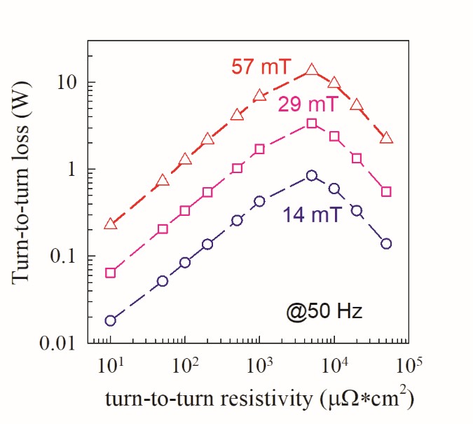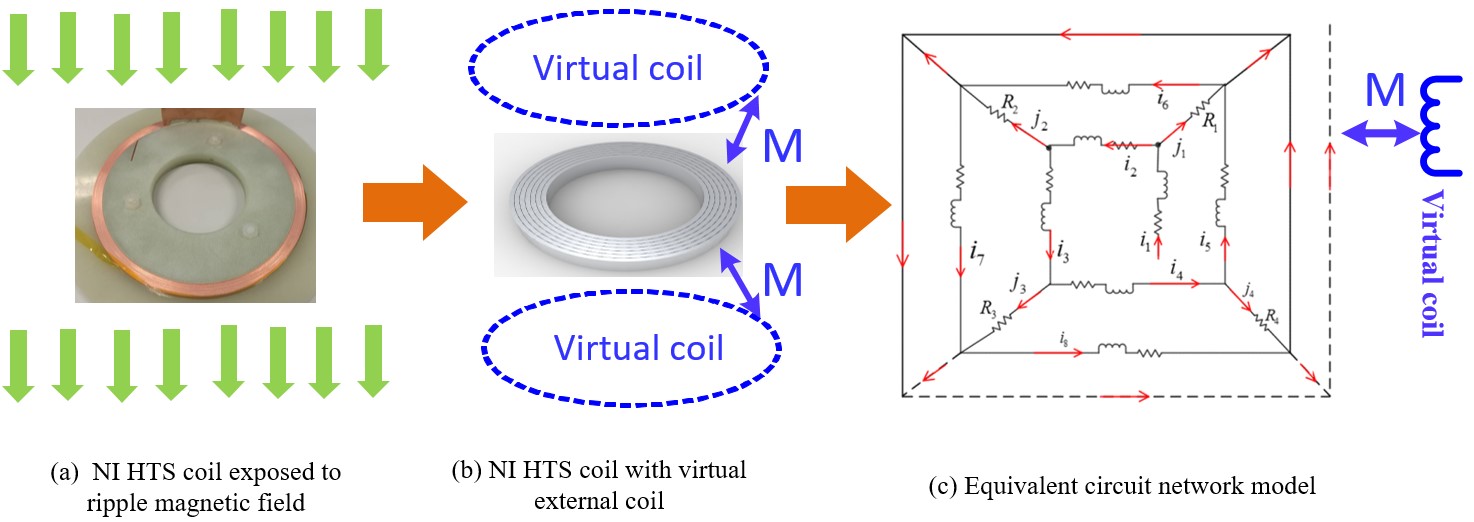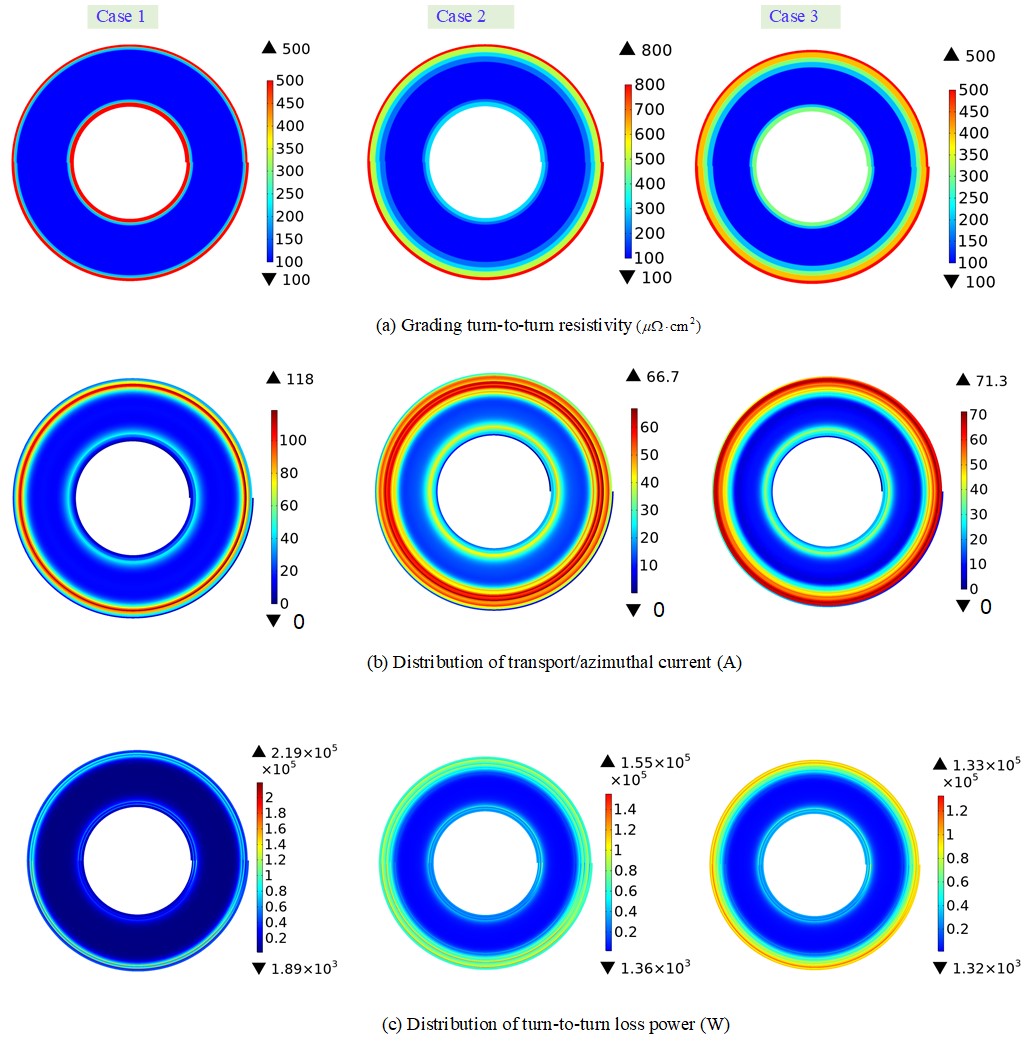 4. The effect of ripple magnetic fields generated by stator windings are studied by both measurements and simulations. The AC losses of the three HTS coils exposed to AC external magnetic fields are measured by the calibration free method. The measurement shows that the AC loss of the NI HTS coils under ripple magnetic fields is 50 times higher than that of its insulated counterpart. The simulation results also show the same results. Results from simulation also obtain similar results, and it also find that most of eddy current accumulates on the outer turns of the NI HTS coil, and a very small external ripple field may induce a very high eddy current on outermost turns. Therefore, AC loss may be challenging for the efficiency of HTS machines, when the NI coil is applied in machine environment with ripple fields. A grading turn-to-turn resistivity technique is proposed to solve this problem successfully.