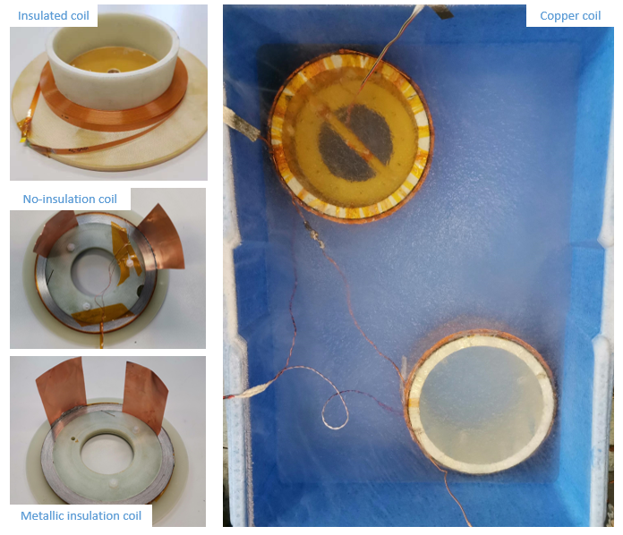 3. The thermal stability of the NI HTS coil under machine environment are also studied by simulation and experiments. A copper solenoid coil is wound to generate an AC magnetic field, which is to simulate the ripple background fields on the rotor windings. Two HTS pancake coils are wound by REBCO tapes. One is NI coil and the other one is traditional insulated HTS coil for comparison. Hot-spot induced quench test are performed on the two coils. The results validated the enhanced thermal stability of the NI HTS coil under machine environment.